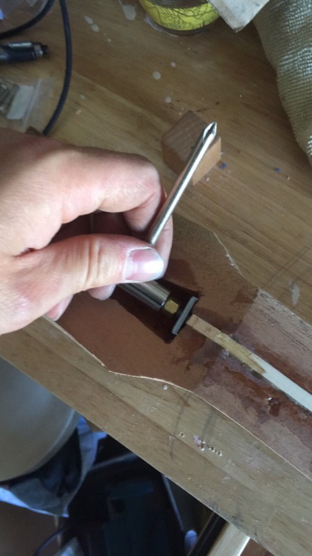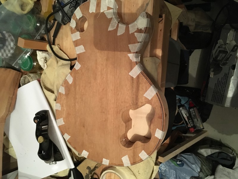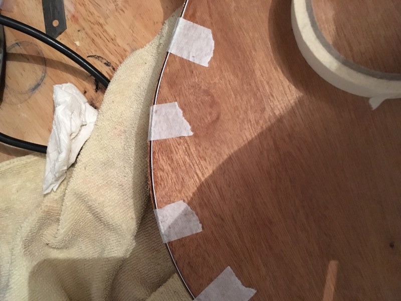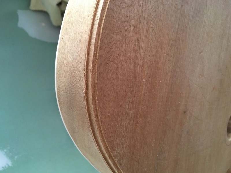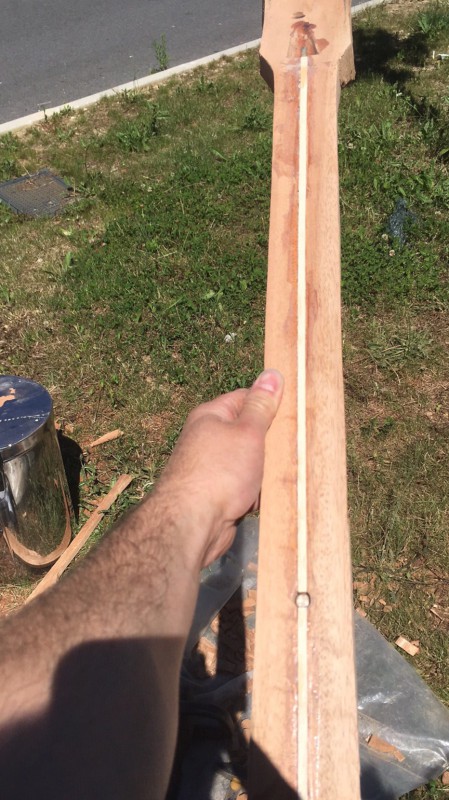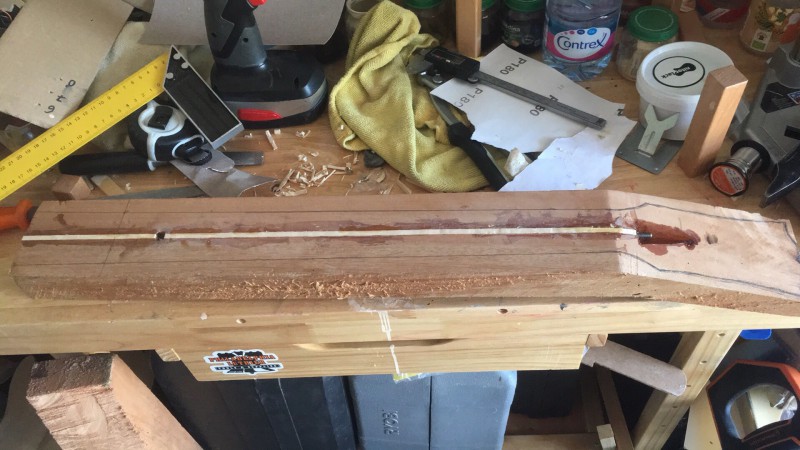 J’ai choisi d’utiliser du purfling pour faire les bandes internes de 0,020 inch d’épaisseur. C’est moins profond, plus flexible, et en deux passes c’est fait (2 white black pour le dos, w/b/w et b/w/b pour la table)