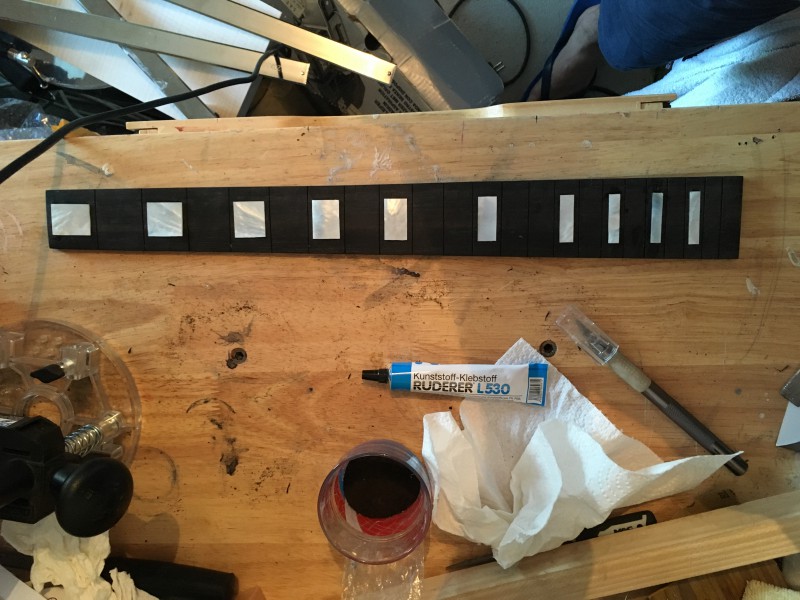 J’ai choisi d’utiliser du purfling pour faire les bandes internes de 0,020 inch d’épaisseur. C’est moins profond, plus flexible, et en deux passes c’est fait (2 white black pour le dos, w/b/w et b/w/b pour la table)