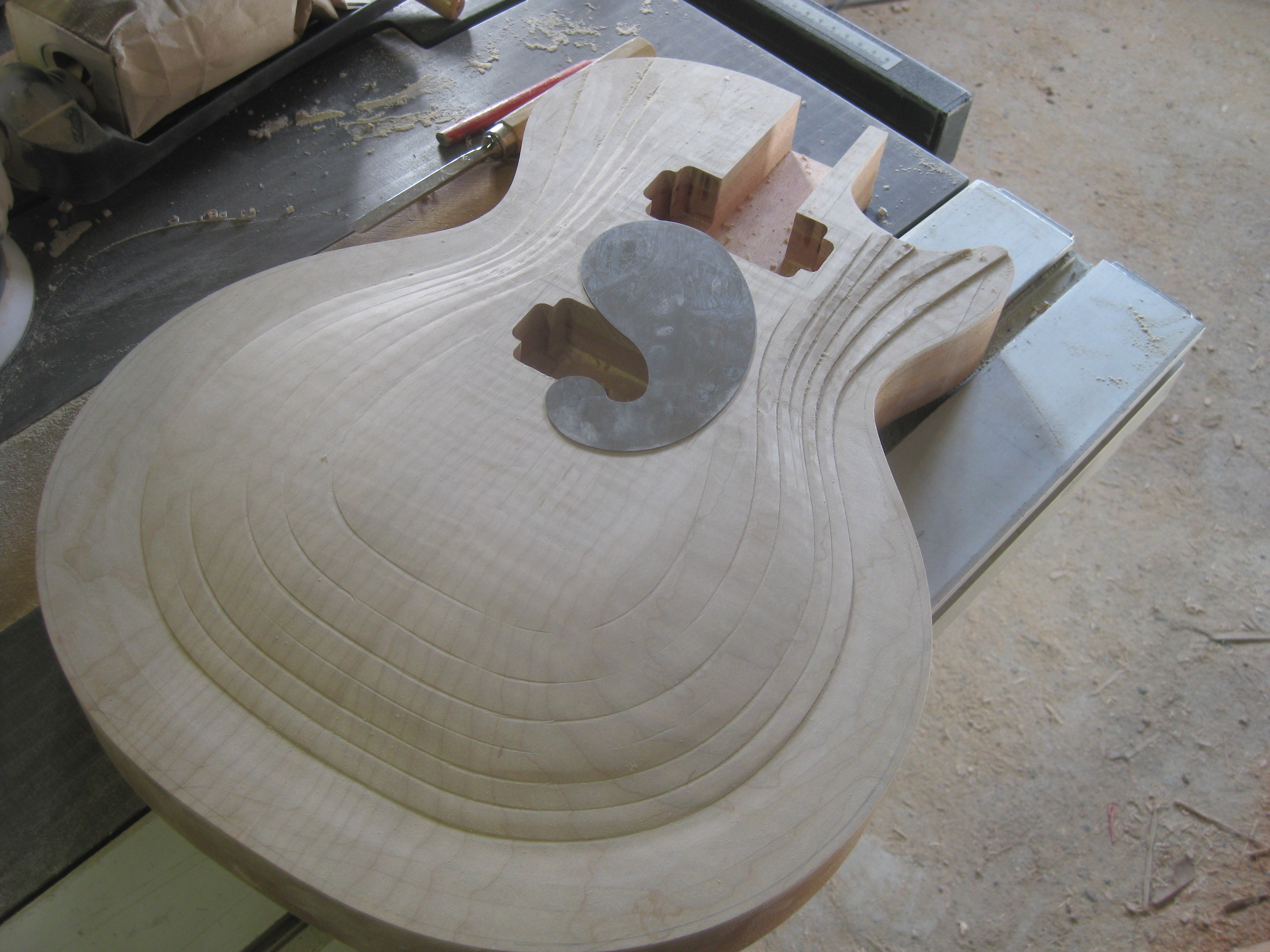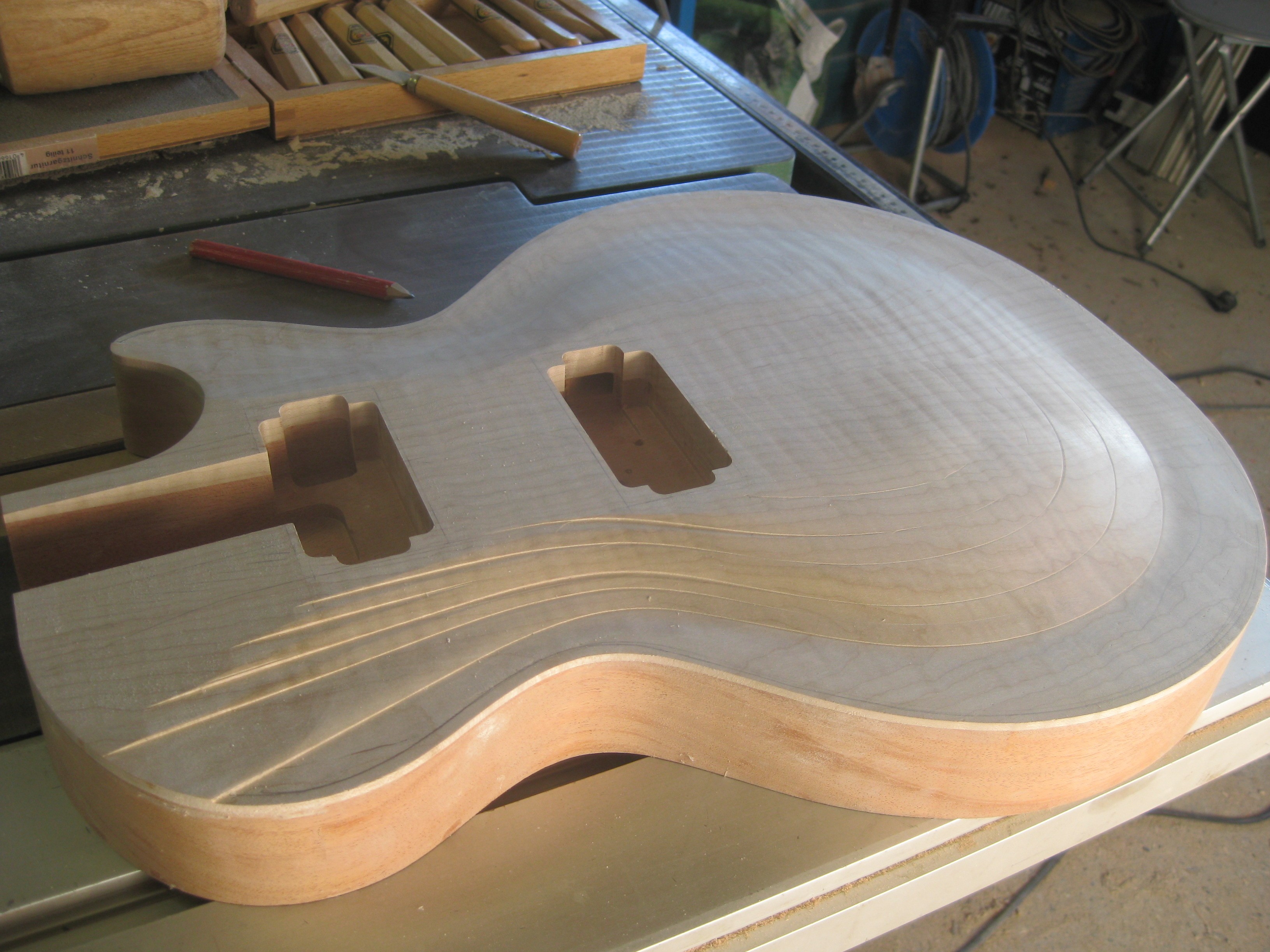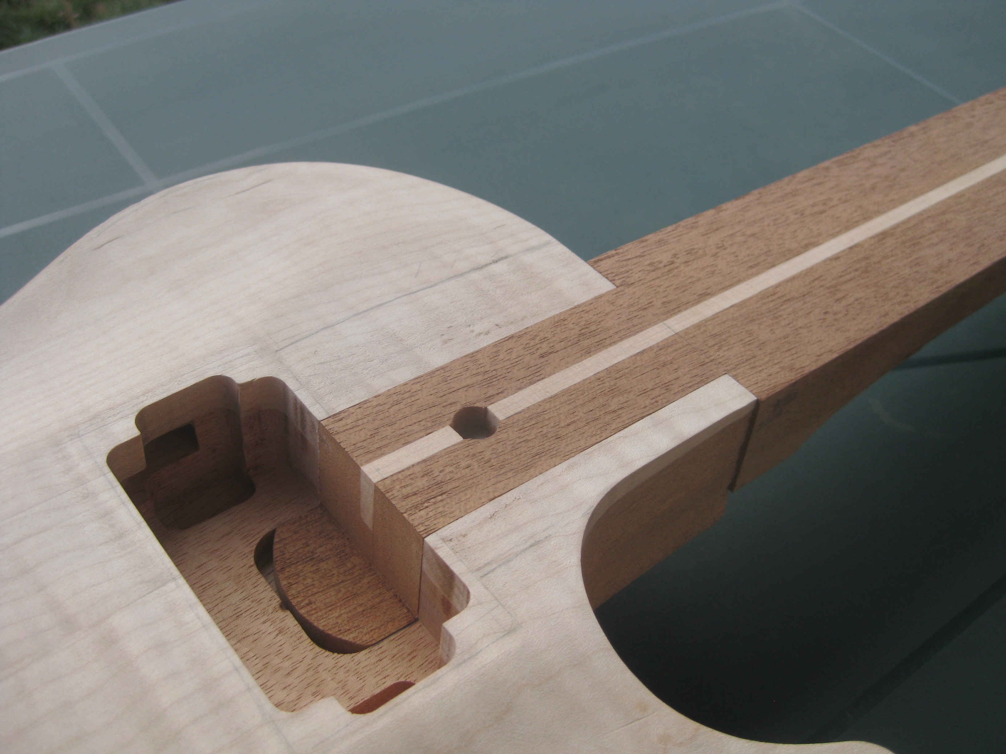 Puis surfaçage des angles de renversements (un pour le manche à 4,4° et un pour le "plat" des micros), défonce du neck pocket et des micros!