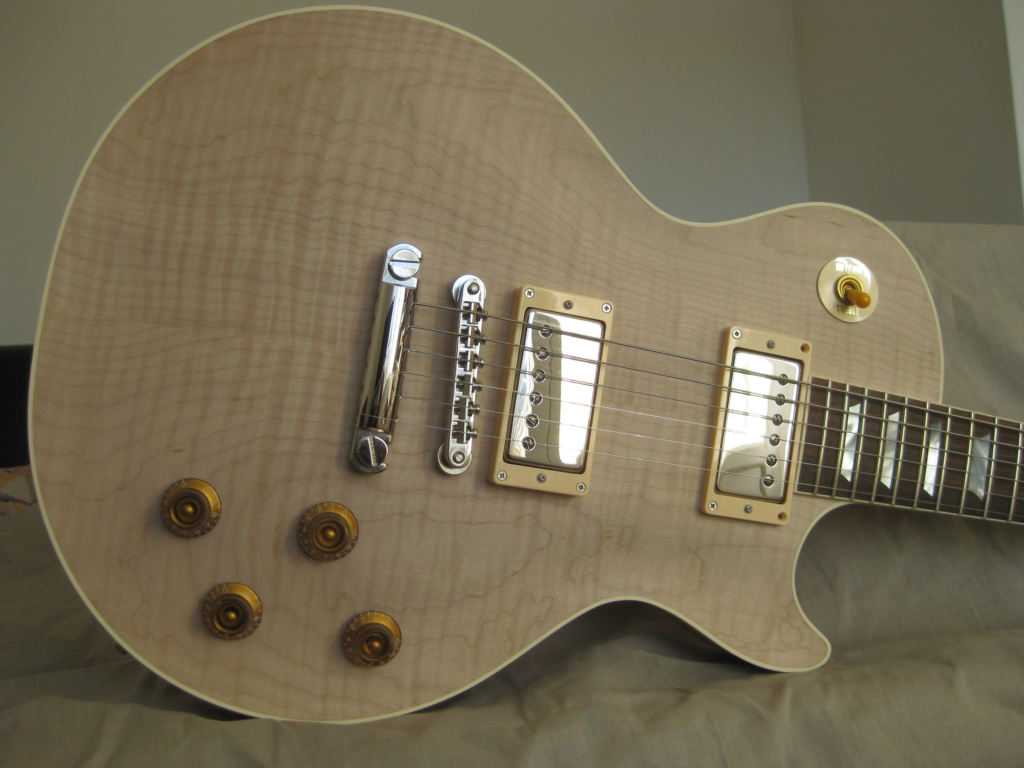 Donc il s'agit d'une replica plutôt fidele, bien que je me sois autorisé quelques écarts ( inlay nacre, sillet Tusq, meca double rings)
