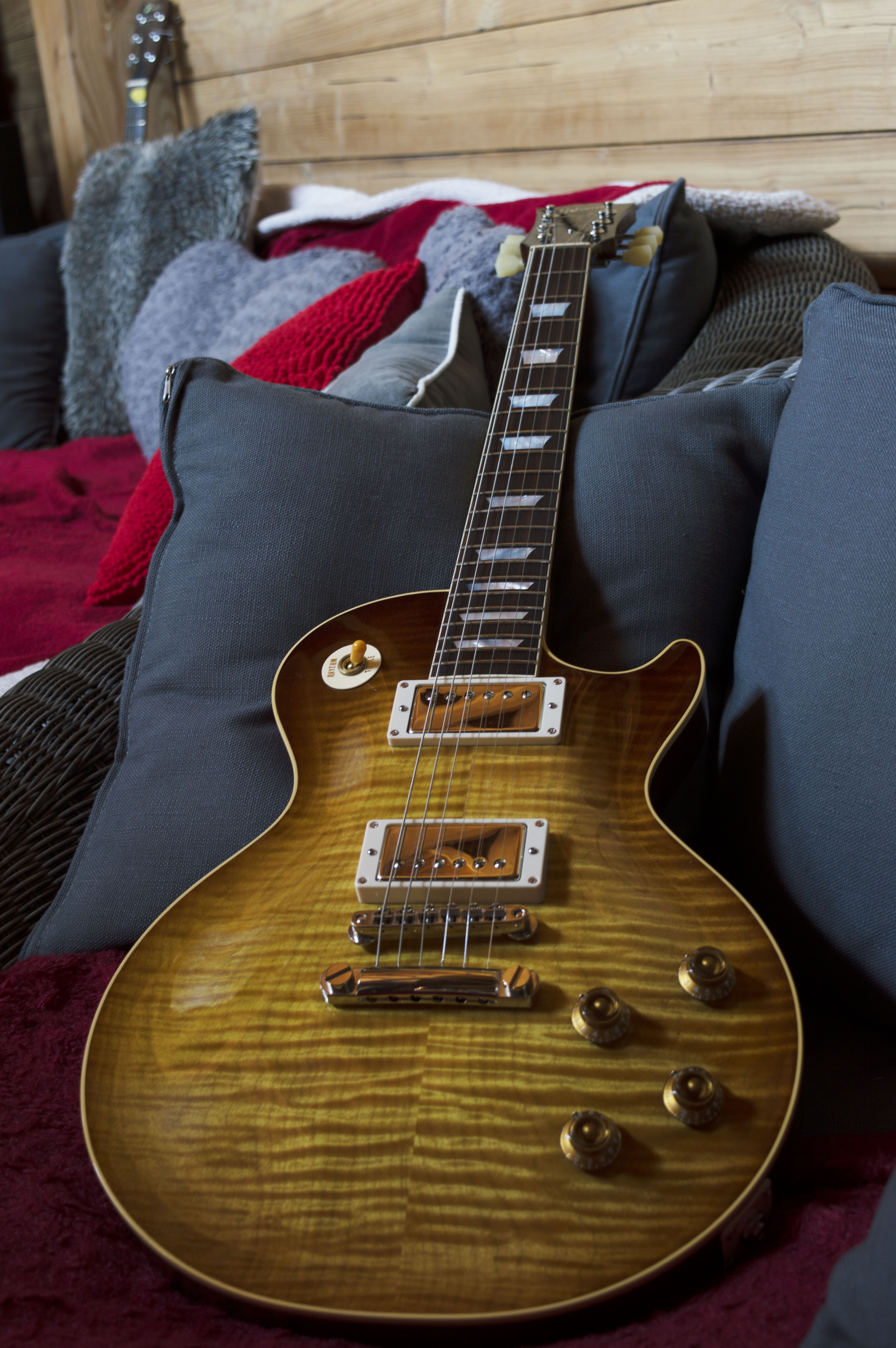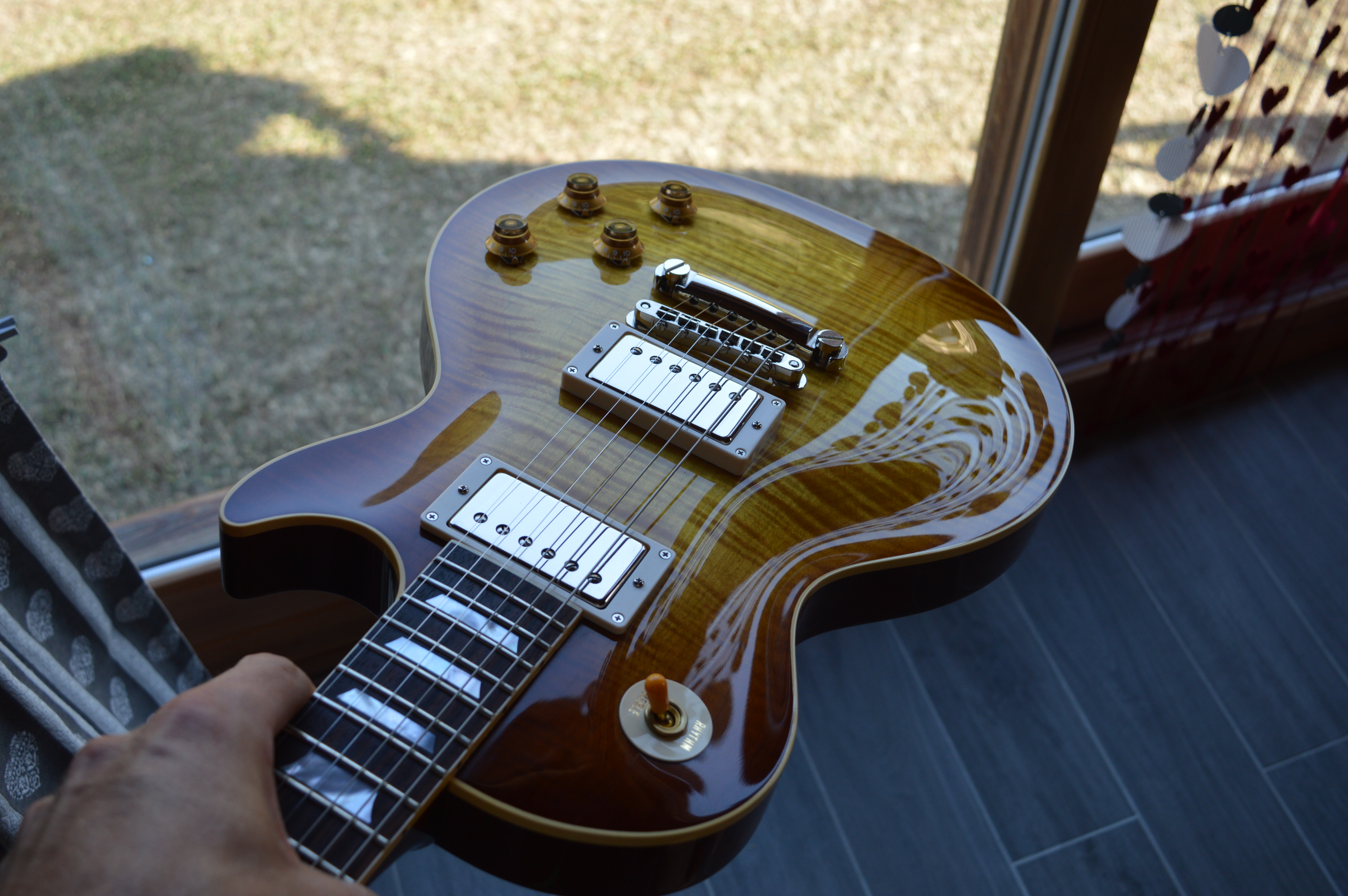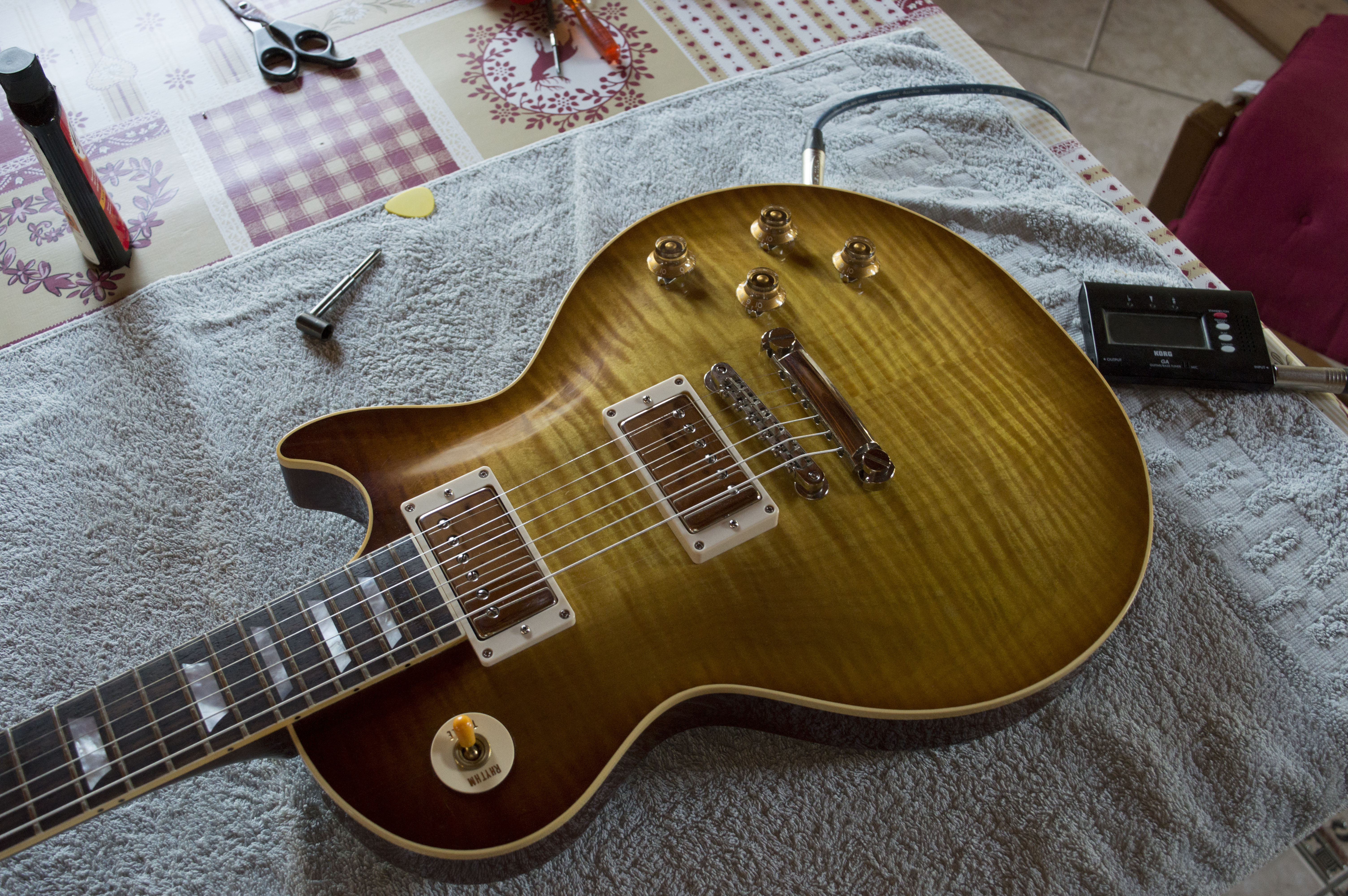 Donc il s'agit d'une replica plutôt fidele, bien que je me sois autorisé quelques écarts ( inlay nacre, sillet Tusq, meca double rings)