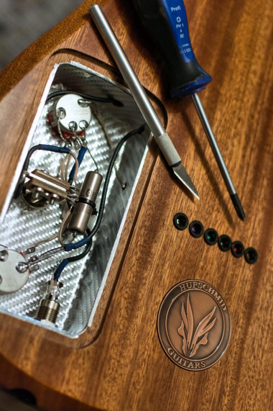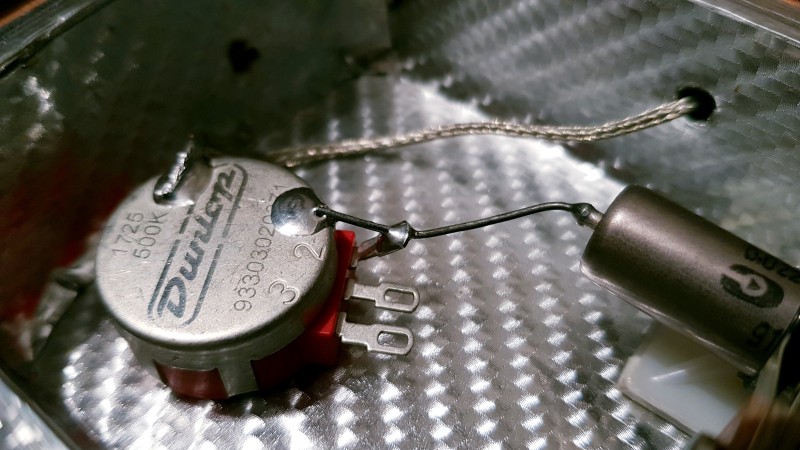 Nouvelle guitare en cours de montage avec les fameux potentiomètres Dunlop pour donner une idée du rendu: