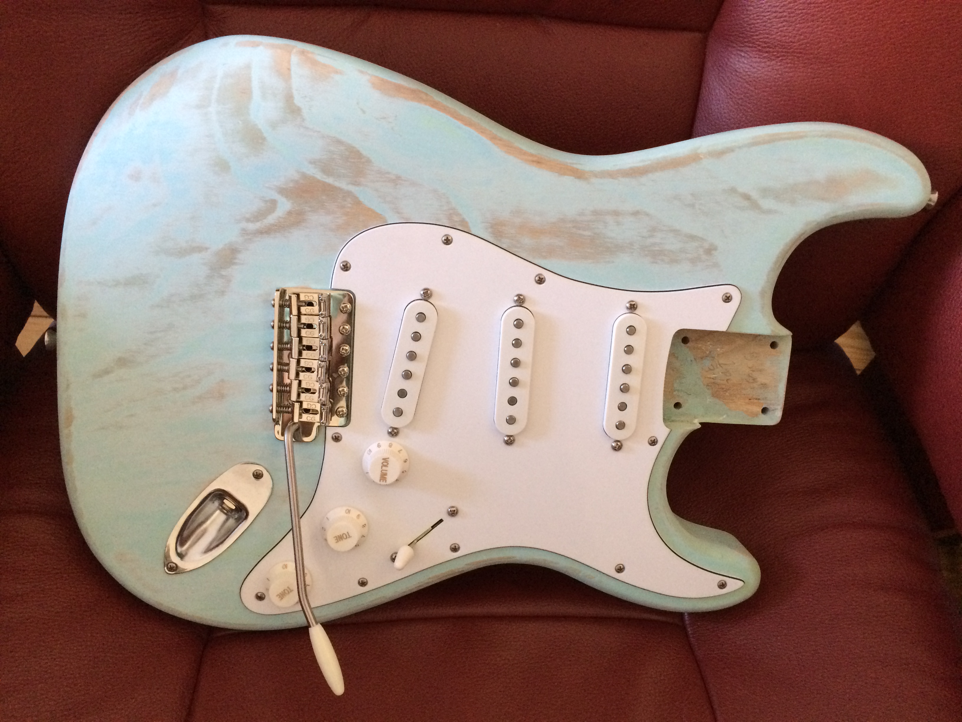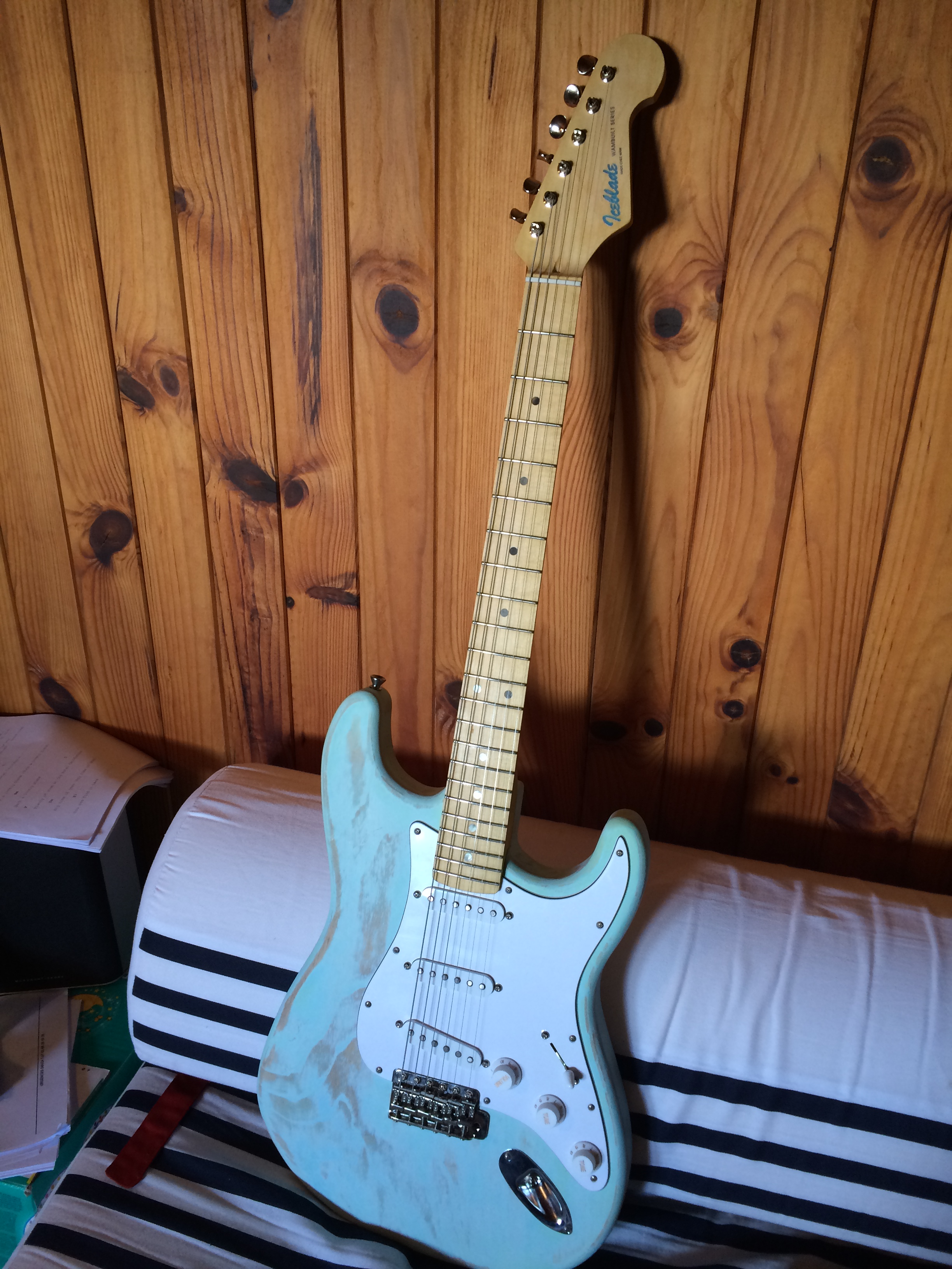J'ai donc pu la brancher aujourd'hui pour la première fois... et je suis vraiment content du résultat. Elle est franchement confortable à jouer, plutôt légère. Je trouve qu'elle sonne vraiment pas mal ; bon j'ai pas encore pu l'essayer très longuement pour l'instant. Les micros Van Zandt sont vraiment sympas. Il va falloir que je passe du temps avec la guitare et l'ampli parce que j'ai eu la sensation que les micros envoyaient beaucoup plus que ce dont j'ai l'habitude sur des micros simples. Le micro grave (Pure Vintage de VZ) est bien équilibré, avec un joli grain. Le micro central Vintage Plus ben... c'est un micro central quoi... il ne m'a pas autant surleculté que le central de ma Eric Johnson, mais les positions intermédiaires sont sympas. Par contre un micro qui m'a bien surleculté c'est le Blues en aigu