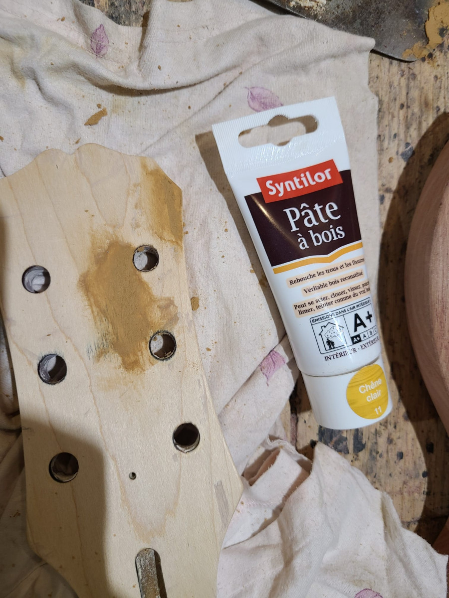 Je rebouche quelques éclats faits avec le racloir ou la lame de rasoir à la pâte à bois. La teinte n'est pas la même, mais peu importe car ces parties seront peintes opaques.