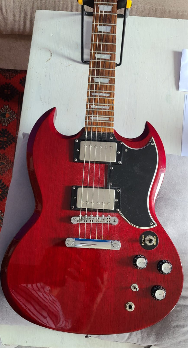 Une SG somme toute classique avec son rouge cherry. Les micros ont été changés 15495437 fois, et là ce sont des Jess Loureiro, parfaits pour des sons rock vintage (d'ailleurs ils sont à vendre du coup....