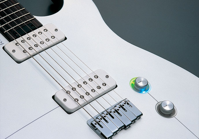 Yamaha RGX A2, deux humbuckers format P90, un potard de volume, un potard qui fait office de sélecteur de micros (3 positions), pas de potard de tone.