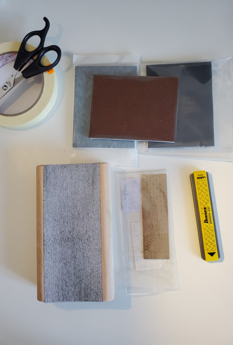 J'ai regardé le papier de verre qui vient dans le kit de music nomad pour avoir une idee du grain. j'ai pris 240, 400 et 800. Le 240 je ne l'ai pas touché, ca lime trop. J'ai tout fait au 400. Et apres polissage. J'aurais du prendre un tampon plus fin que 4000 pour vraiment bien fignoler. 6000 / 8000. Ca aurait été encore plus propre.