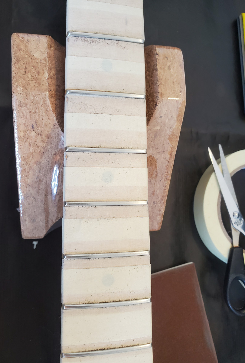 J'ai acheté une cale 10/12 pouces pour poncer avant de refaire les frettes. 10 pour le haut du manche et 12 pour les dernieres cases. Il faut y aller tout doucement pour limer bien droit et respecter la courbure. Si j'avais eu une règle droite plus longue pour démarrer ça aurait été mieux. Je ne joue pas trop en bas de manche donc j'ai fait moins de passes dans cette zone. et verifié avec une règle qu'il n'y avait pas de frette plus haute.