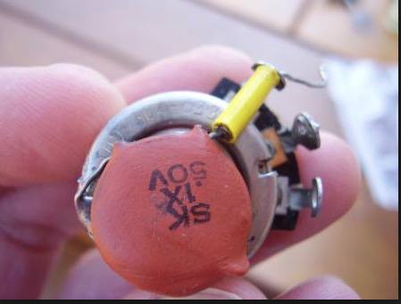 Condensateur de tonalité; isolant jaune pour éviter un court-circuit avec la masse.