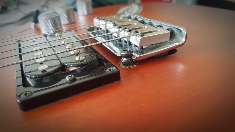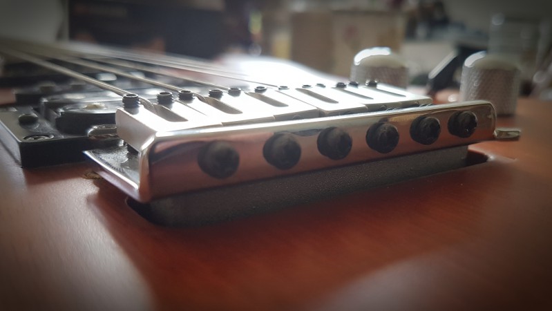 Je ne sais pas si c'est un énorme problème en soi ? Car il marche super bien ainsi (étonnamment stable d'ailleurs). Mais le bloc chevalet est très haut. Naturellement, le premier truc qui me soit venu à l'esprit, c'est de le rabaisser au niveau de la table (logique, surtout qu'en général ne me servant pas de la tige, je plaque le vibrato tel un fixe). Je me suis vite rendu compte que ça n'était pas possible, tout simplement car si je fais ça : les cordes sont carrément posées sur la touche du manche ! Ce qui me semble étrange c'est que le manche est bien droit, très droit même. En gros si le bloc vibrato n'est pas "très haut", ça ne passe pas au niveau du manche (et l'action est bien basse lorsque le bloc est "haut perché").