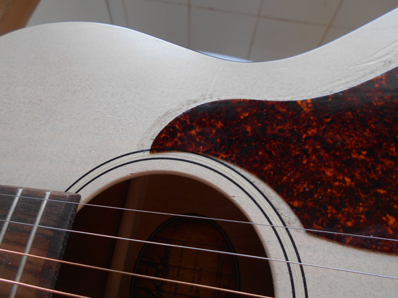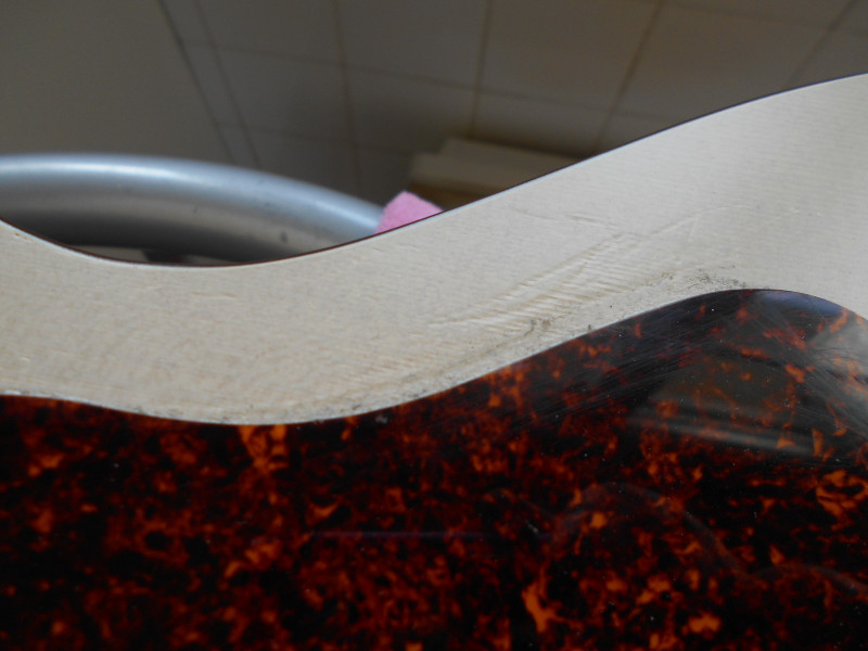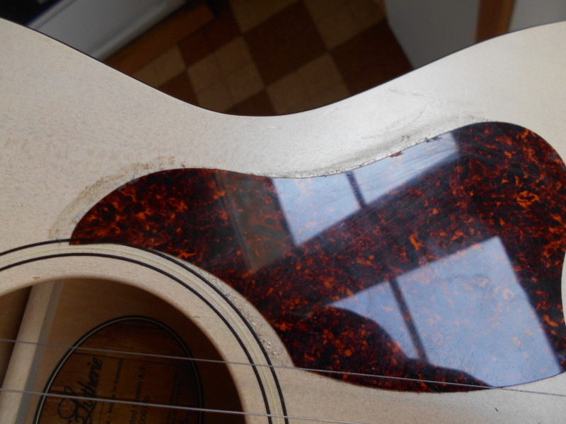 la personne qui avait cette guitare, après s'en être servie un mois a vu des pluches sous le pick guard et s'est aperçu qu'il y avait de la colle sous les pluches. il a pensé que la colle avait débordé, il a pris un mediator et un chiffon et a frotté autour du pick.