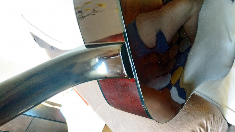 J'ai racheté cette guitare à un proche l'été dernier, tout se passait bien jusqu'à il y a 2-3 mois. En effet, en voulant nettoyer ma guitare avec un chiffon et une cire "Musicnomade - the guitar one"(acheter dans une boutique de musique), je commence à voir apparaître des zones sur la guitare des sortes de traces légèrement blanchâtre à la lumière, comme des traces de doigts sur un smartphone. Au touché, cela donne l'impression que le vernis est sec.