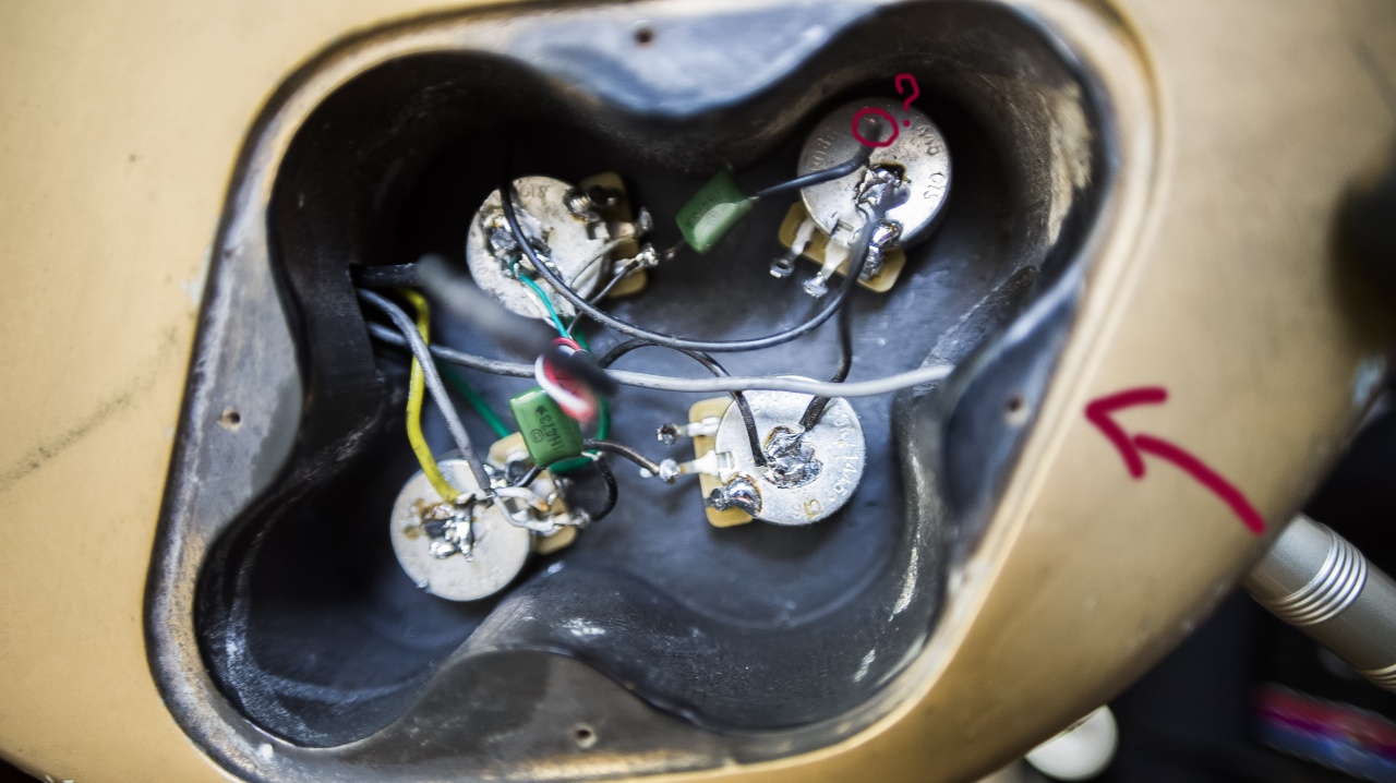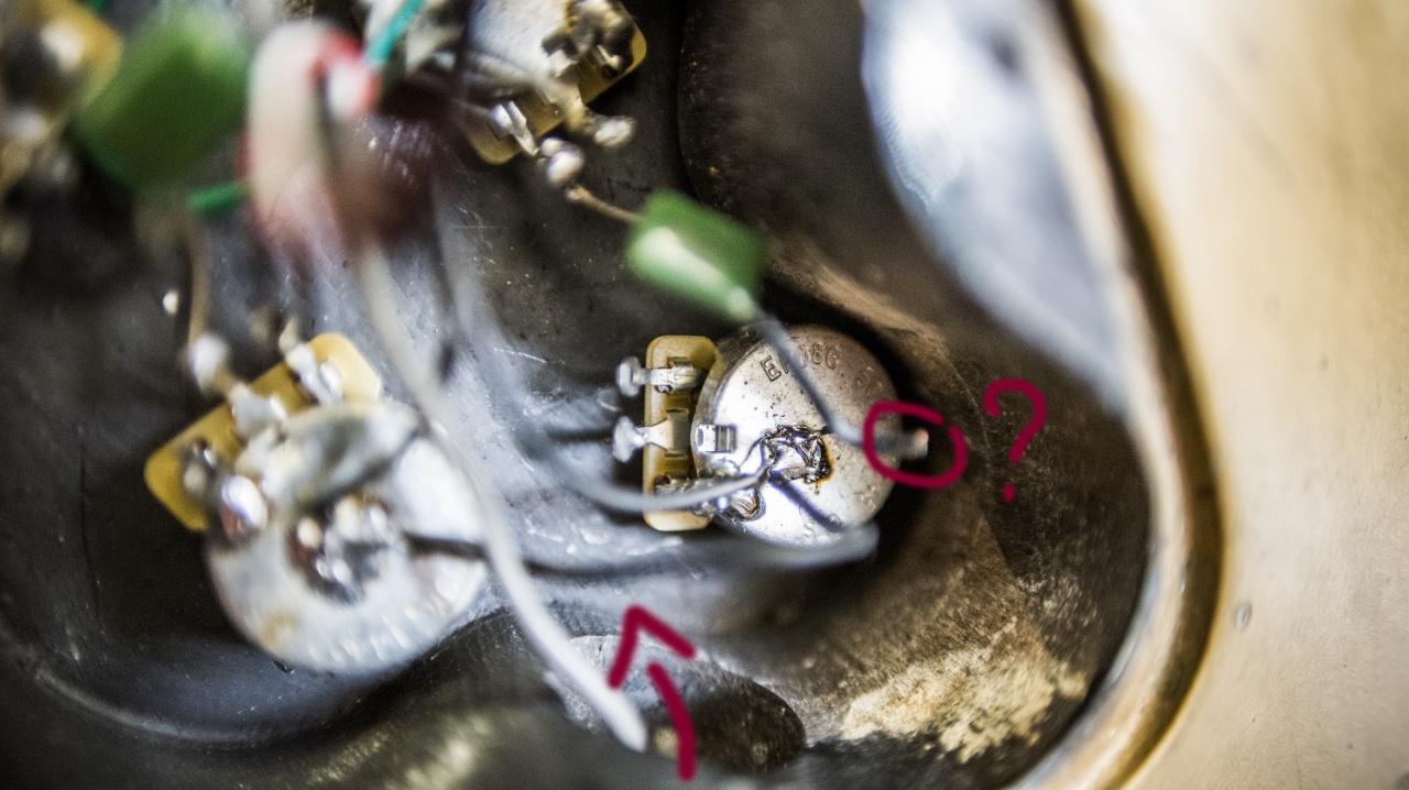 Depuis quelques jours ma guitare faisait un gros broua quand je ne touché pas les cordes et depuis hier il n'y a plus qu'un gros bruit bien moche et rien d'autre j'ai donc ouvert le cache arrière et j'ai remarqué qu'un câble n'étais plus soudé à un des potards, voici des photos :