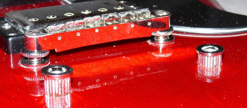 J'ai une épiphone G400. Les inserts du stopbar ont du jeu et ne sont plus montés serrés dans leur perçage. Il se soulèvent très facilement à la main. Lorsque je tends les cordes ceux ci se soulèvent un peu et s'inclinent vers l'avant, le stopbar est donc incliné.