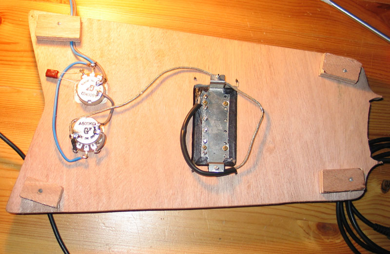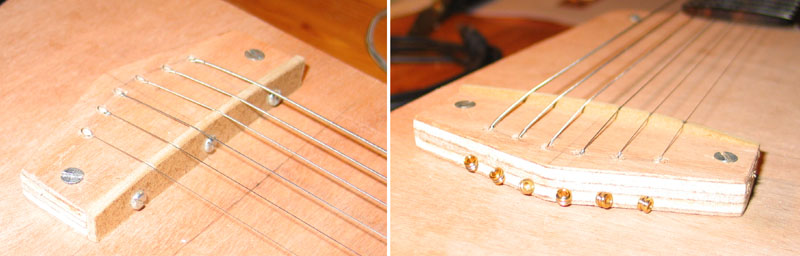 J'ai d'abord testé un chevalet à plat type telecaster avec ancrage des cordes à l'arrière - non traversantes, mais c'est vraiment mal fichu! Il met en œuvre un total de trente pièces mobiles en métal et il y en a toujours une qui vibre. L'ensemble est très instable et bien trop complexe à mon goût... Exit.