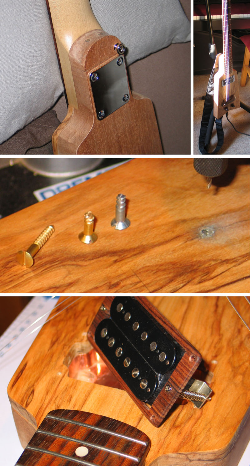 Je n'ai pas dit mon dernier mot sur ce point - j'envisage de sculpter une sorte de corne style stratocaster, qui me permettrait de placer l'attache sangle avant plus loin de l'axe du manche. Ça va peut être pas être très beau non plus... mais l'aventure continue!