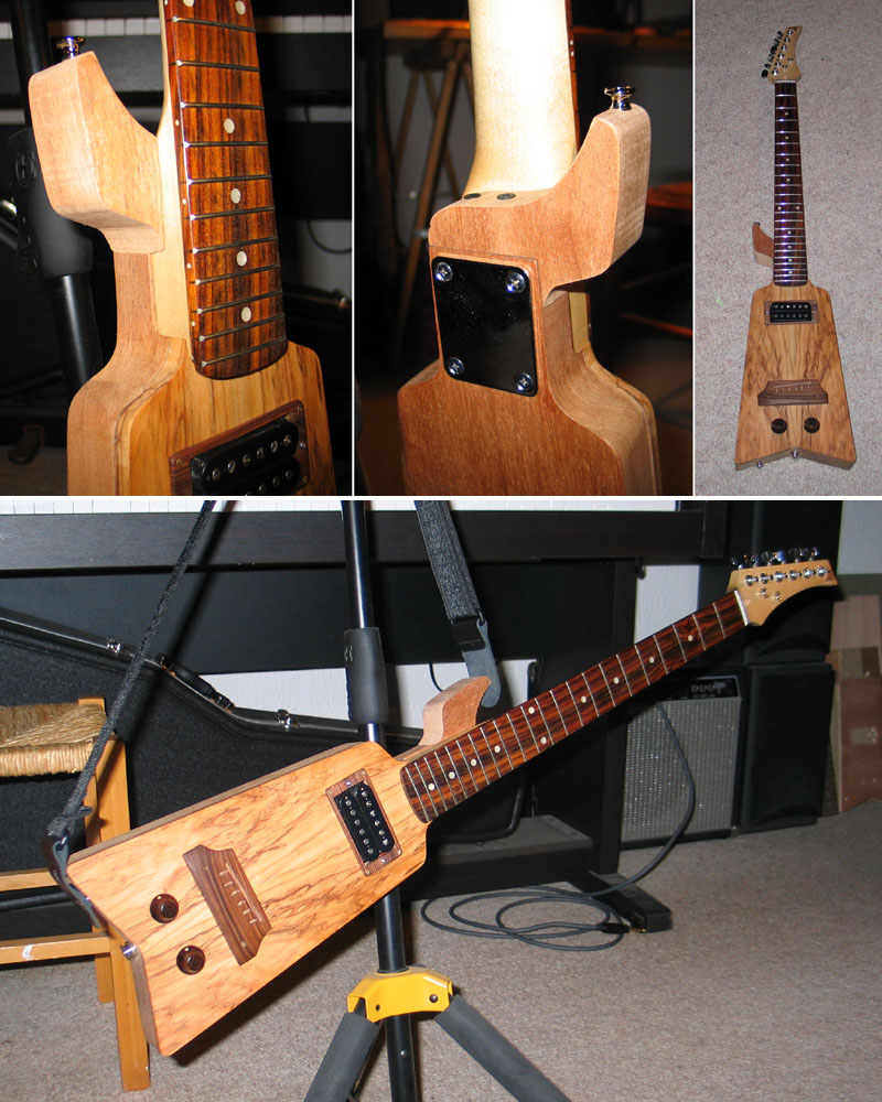 Le problème c'est le poids des mécaniques en bout de manche, et sur le haut de la tête. Le corps n'est pas assez étendu et lourd pour compenser cette masse au bout de ce levier. La solution c'est un manche sans tête avec les mécaniques 'inversées', en bas du corps - ce qui est généralement le cas pour ce genre de petite guitare.