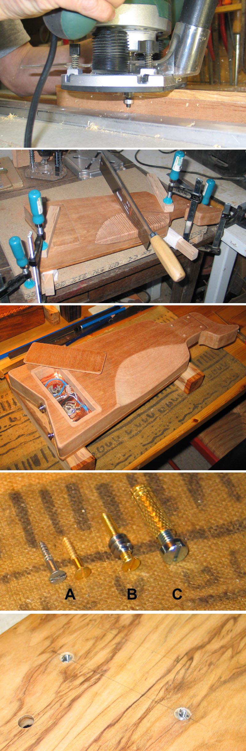 Côté progression, le bords de la table à été fraisé pour s'aligner sur le corps - douce odeur du copeaux d'olivier. J'ai aussi effectué une découpe stomacale sur le dos - à la scie puis à la râpe, et la cavité électronique est maintenant fermée par une plaque en acajou encastrée. J'ai aussi commencé à arrondir tout les angles du corps en vue de passer au vernis sous peu.