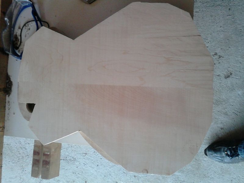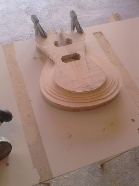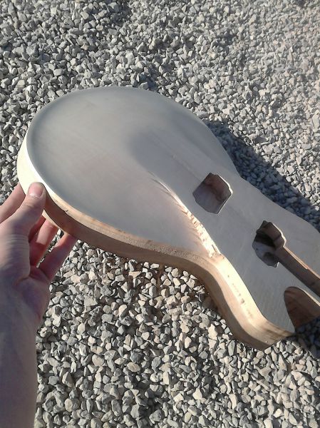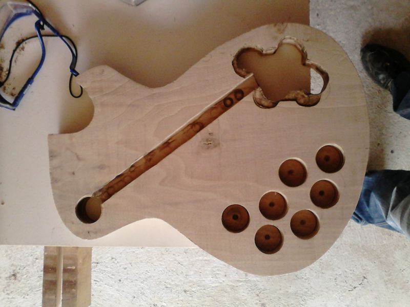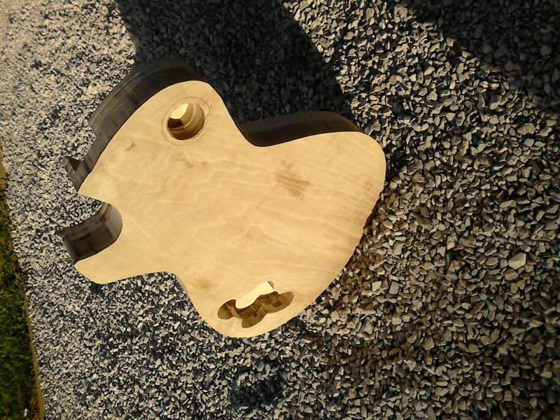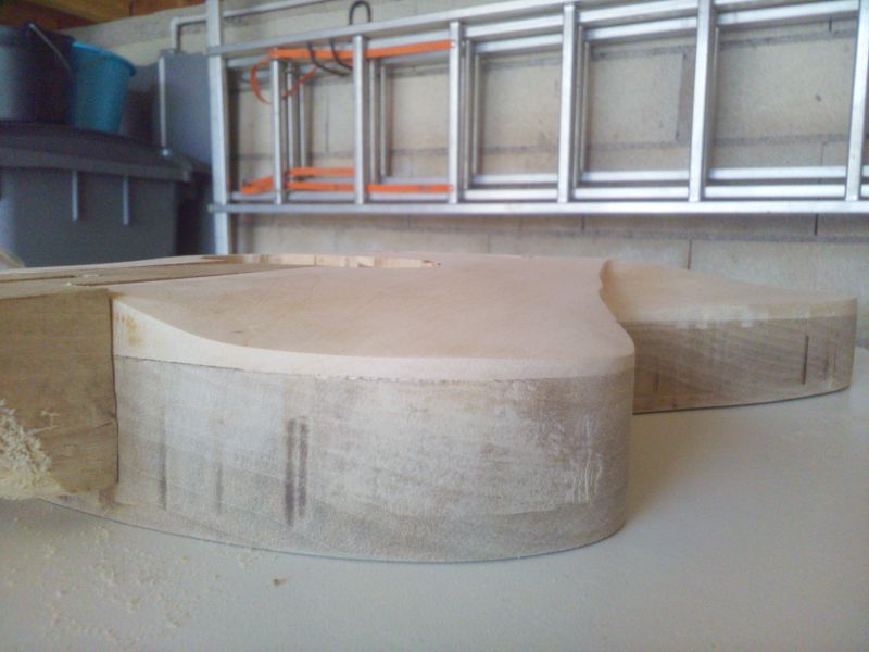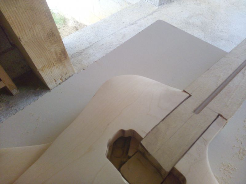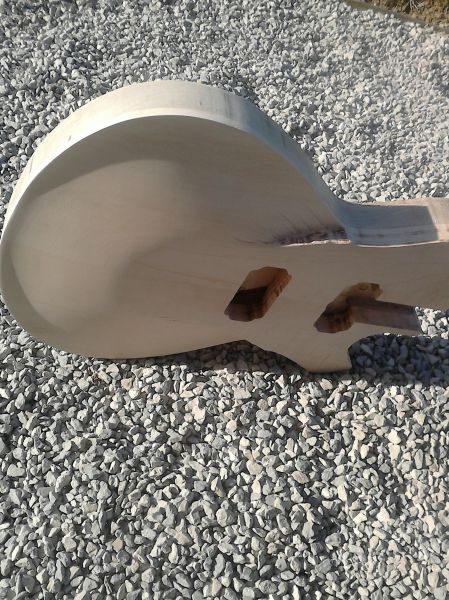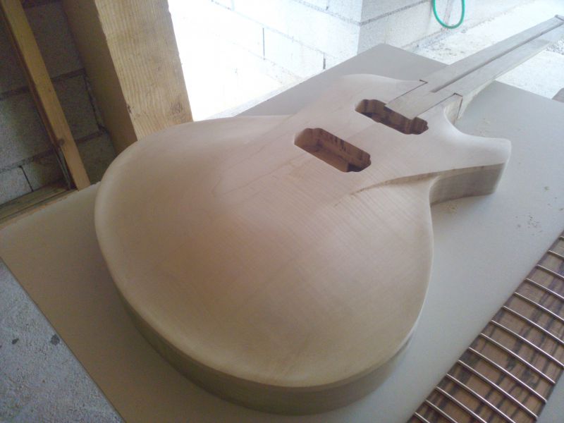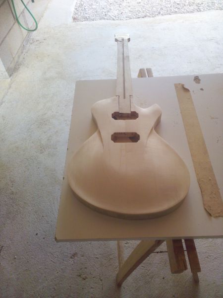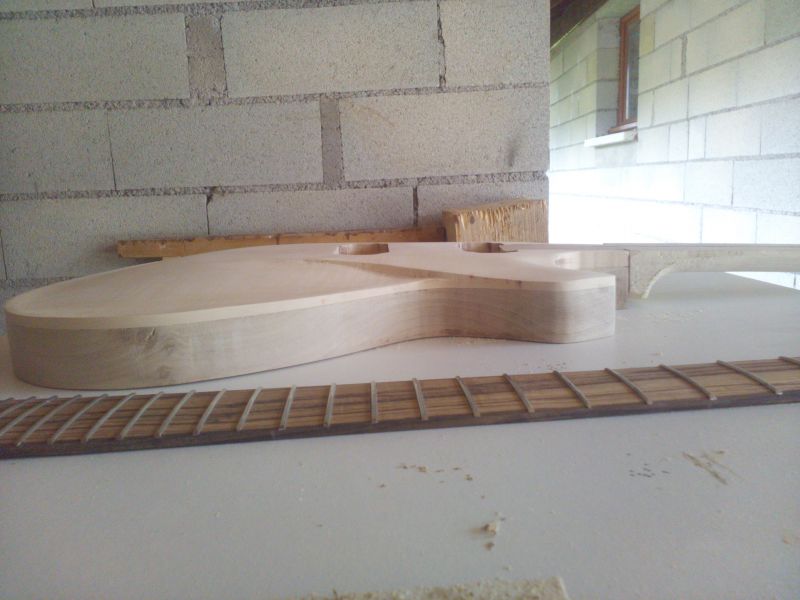 Le corps prends forme après le collage de la table et affleurage. Il y a quelques traces de brulures mais rien d'irrécupérable, j'ai également réalisé les défonces micros et du tenon :