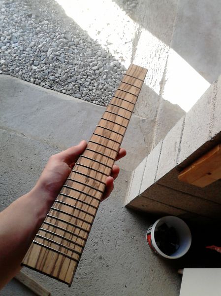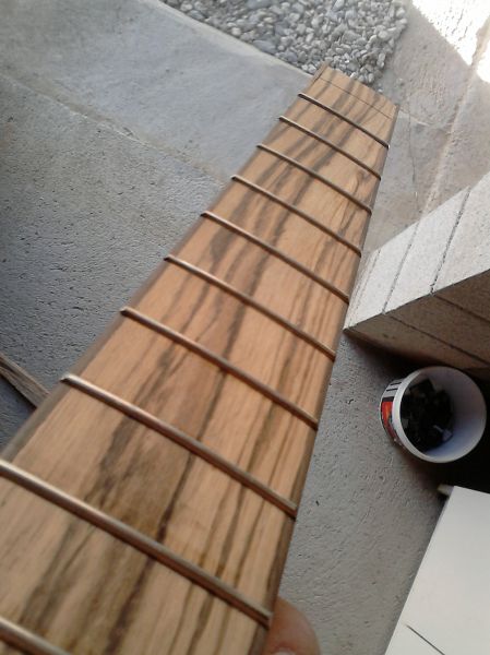Radius de 12" avec une cale faite maison, slottage avec une boite à onglet. Les frettes sont en inox, c'est du chien! J'ai du utiliser une meule pour couper les pieds de frettes au niveau du binding :