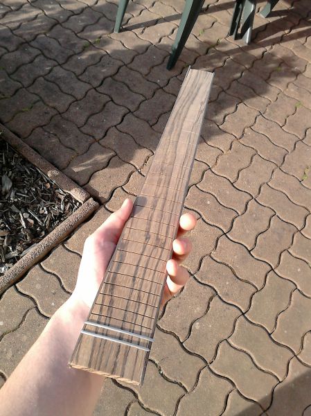 Réalisation de la touche en Zebrano avec un binding en palissandre :