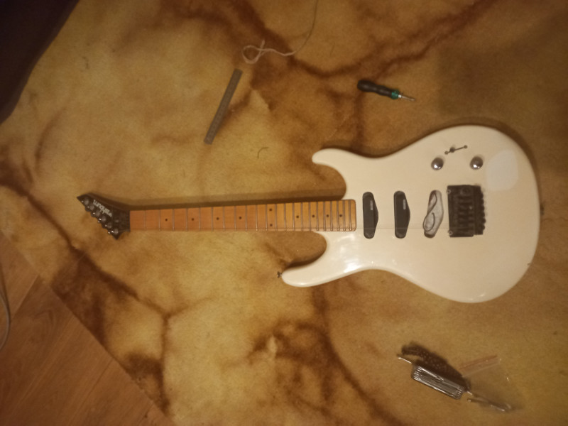 Magnifique guitare avec une sacré histoire. Made in USA si j'ai bien compris, en 86 ou 87. Elle a été acheté aux USA, avant d'être racheter par un club de motard, et de finir dans un grenier pendant 20 ans. Et c'est la que j'arrive. Pour 30€.. Bon à ce prix là je me suis jeter dessus, je risque pas grand chose.