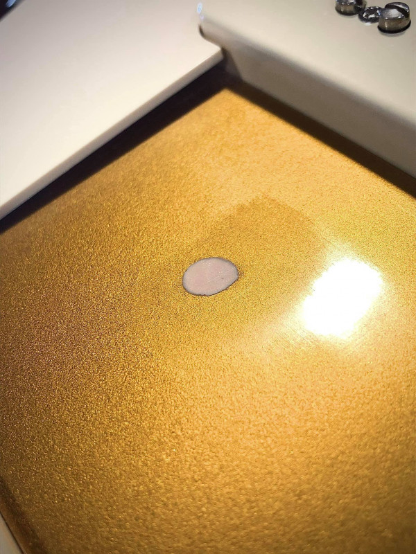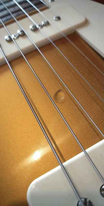 Sinon comme pour une voiture, tu combles, tu trouve la même teinte ( métallisée pas facile), puis tu fais un vernis noyé. Du ponçage à l'eau au grain fin (2000 et 3000) et beaucoup de patience.