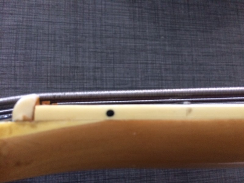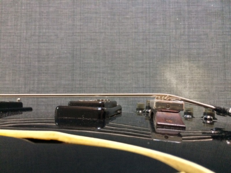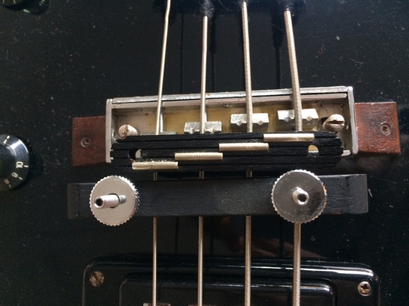 Le chevalet est bien celui d'origine (j'ai trouvé la même basse sur le net). J'avais pensé à le changer pour un moins haut. Voir limer la partie en bois.