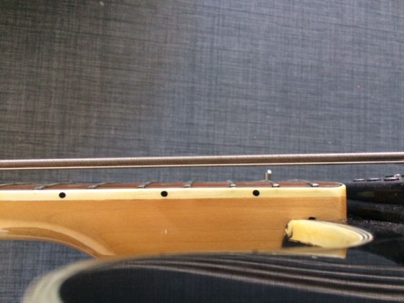 Achetée d'occasion, (il y a un moment déjà), l'ancien proprio avait mis une cale en fer qui inclinait le manche.