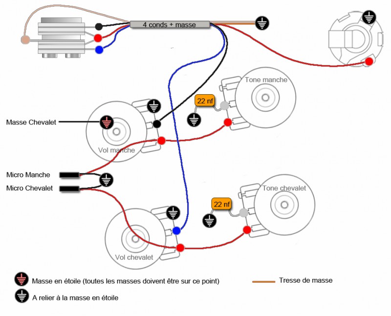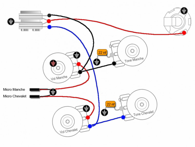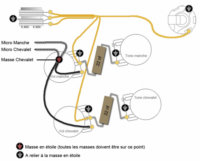 ps: du coup les micros sont branchés directement aux potards volumes et il en va de même pour le sélecteur c'est bien ça ? Mais du coup quels sont les cables qui vont au jack ?