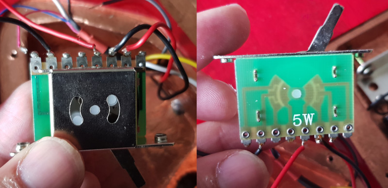 la borne 1 et 2 qui sont reliées ensemble (donc micro Bridge et Middle en parallèle) qui sont reliées à la borne 4 (en direction du volume) mais aussi la borne 6 et 7 qui sont reliées entre elles ce qui envoie donc les fils Noir/Blanc à la masse et qui split le humbucker.