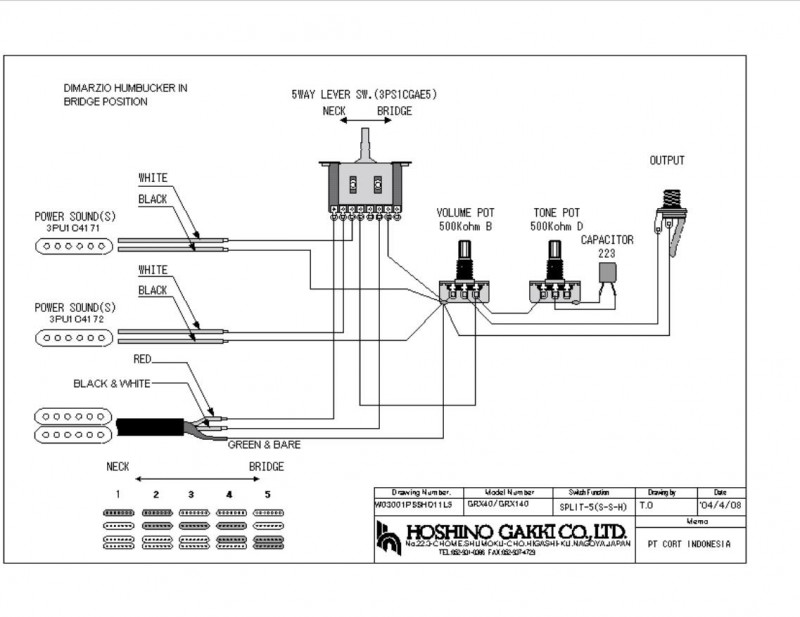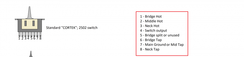 Pour l'exemple dans le schéma sus-cité, en connectant les fils Noir/Blanc du Humbucker à la borne 6 , et en mettant la borne 7 à la masse, quand tu passes en position 4 tu as
