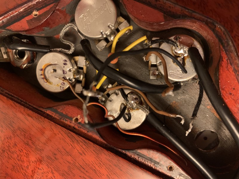 Le sélecteur de ma SG étant mort, j’ai entrepris de le dessouder pour en remettre un nouveau. Pas de problème pour enlever les 3 premiers câbles, en revanche, impossible d’enlever le dernier, vu qu’il passe dans un petit arceau.