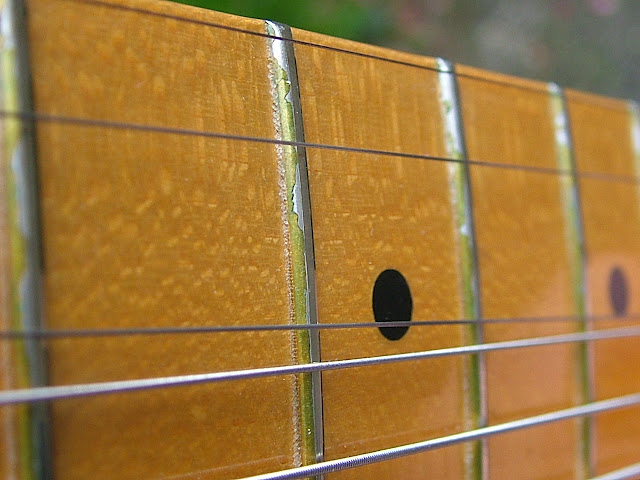 Lorsque j'ai reçu la guitare (d'occasion), j'ai fait des photos. Sur celles des frettes prises en gros plan, on voit que le verni recouvre en partie ces frettes: