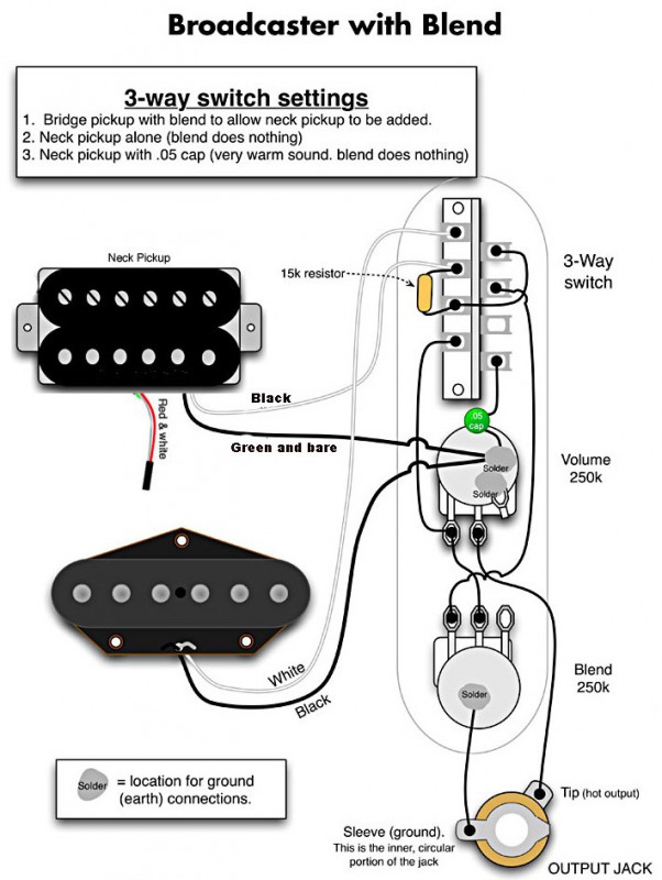 j'ai effectué ce montage sur une telecaster. Pour les micros, j'ai pris un Humbucker Gibson 57 classic pour le manche et pour le chevalet un Seymour Duncan Broadcaster vintage STL 1B, qui se rapproche beaucoup du micro original sur les premières telecaster. Concernant le cablage, la résistance de 15k sert uniquement à régler la différence de volume entre le micro manche et le micro chevalet . Après différents essais avec différentes valeurs, j'ai fini par mettre un cavalier (donc pas de résistance) car je souhaitais avoir une intensité sonore identique entre les 2 micros.