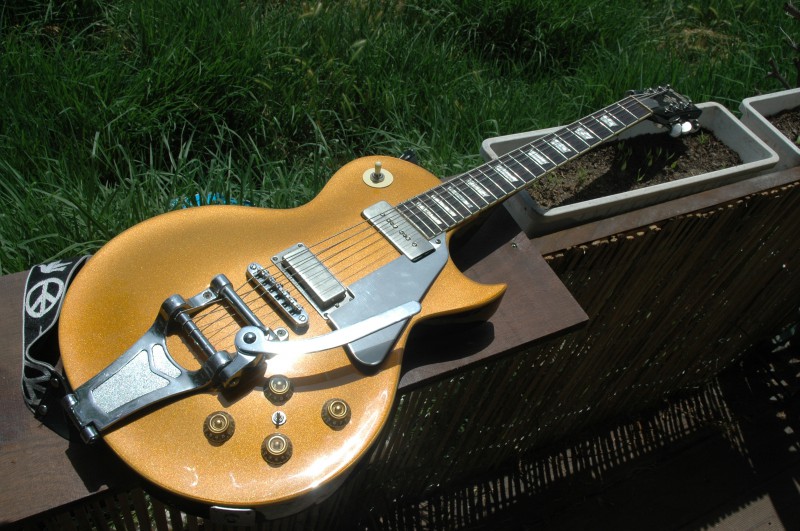 Monté sur une modeste Vintage V100GT goldtop d'occase (je n'avais pas les moyens d'acheter une authentique 1952 ou 1953), le résultat est absolument époustouflant : ça sonne "Neil Young" à mort ! Accordée en double drop D, c'est tout bonnement monstrueux ...