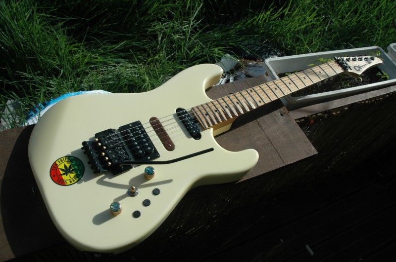 Présentation de mon autre guitare tornadisée. Tout au départ, c'est une Charvel Model 4 dont il ne reste que le corps et le vibrato, le manche vient d'une Lag The Beast (malgré le logo Charvel) et il n'y avait plus qu'un micro, pas d'origine, un Seymour TB11 (pas mal du tout, d'ailleurs). Guitare récupérée en échange d'un refrettage ou du câblage de micros pour un pote, je ne sais plus ... Je lui monte un Seymour JbJr double format simple en manche (un cache en bois amovible pour le micro central) et je fais un câblage simple, volume, tona, toggle switch et split simple/double sur la tona. Vraiment une super guitare, le manche Lag est extra, ça sonne bien hard rock, les deux Seymour s'accordent très bien, etc.