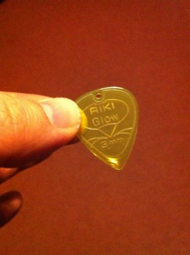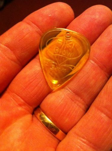 Un plectre en PMMA plexiglas complètement transparent avec une couleur flashy et la marque de son maitre gravée en son centre.