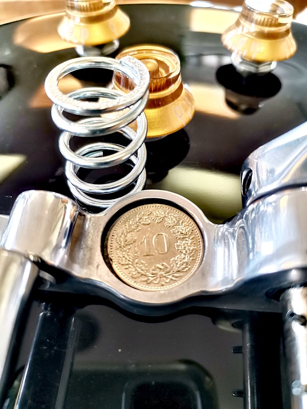 4 Remplacer la rondelle en plastique au niveau du ressort par quelque chose qui ne se déforme pas. Dans mon cas, une pièce de 10 centimes (Suisse. Pour vos Euros, je vous laisse mesurer quelle pièce convient…) fait parfaitement l’affaire.