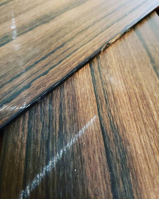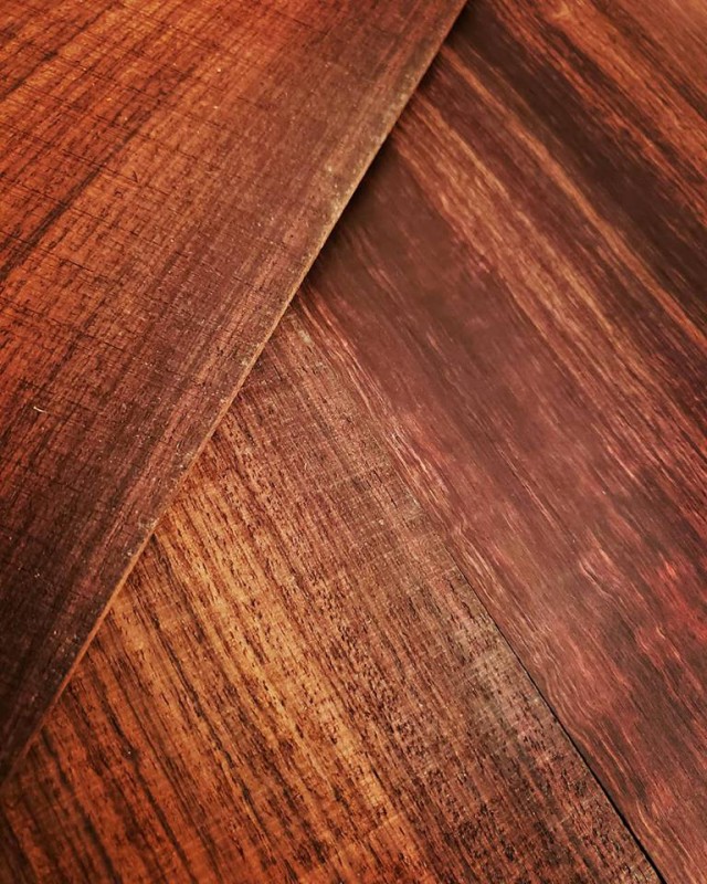 Comment ça se travaille: Ce bois est très dur, et contient beaucoup de résine. C'est donc un enfer à venir poncer. C'est par contre très satisfaisant à raboter/racler. J'ai utilisé ce bois pour des chevalets, des placages, et c'était un plaisir à travailler
