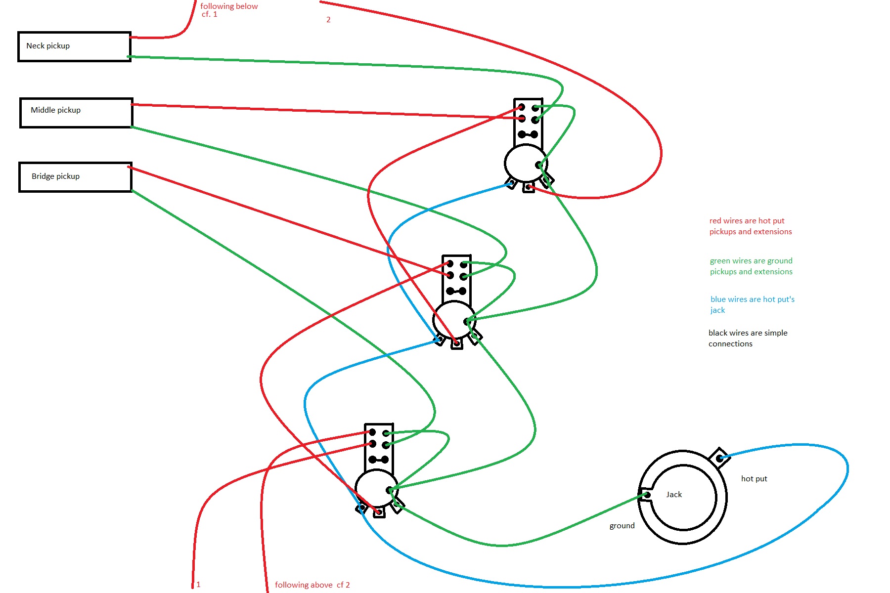 Je me suis aidé de schéma fournis par seymour duncan (du pain béni), notamment celui-là: