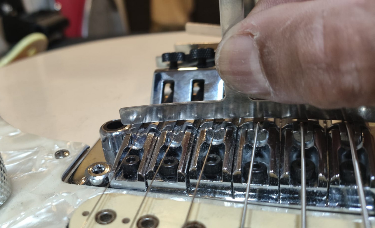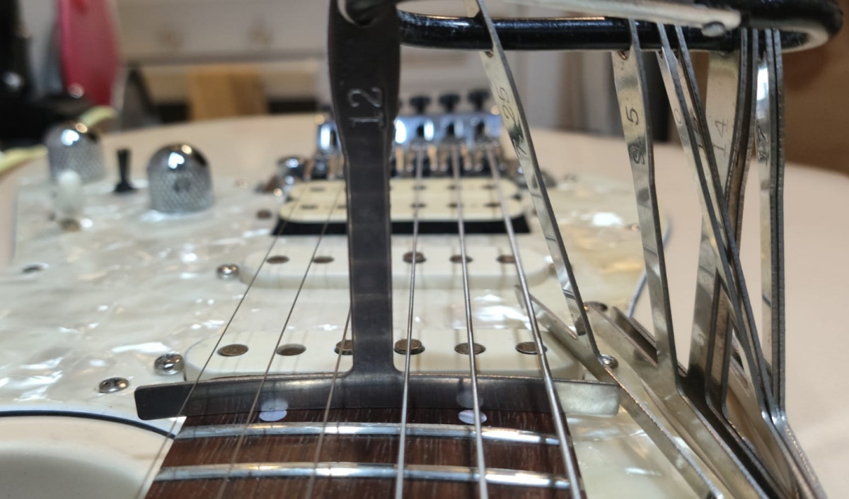- corriger la courbure des pontets en mettant une cale de 0.2 sous les 2 cordes de mi et une cale de 0.1 sous le la et le si. (suggestion de Mistral AI Le chat ...)
