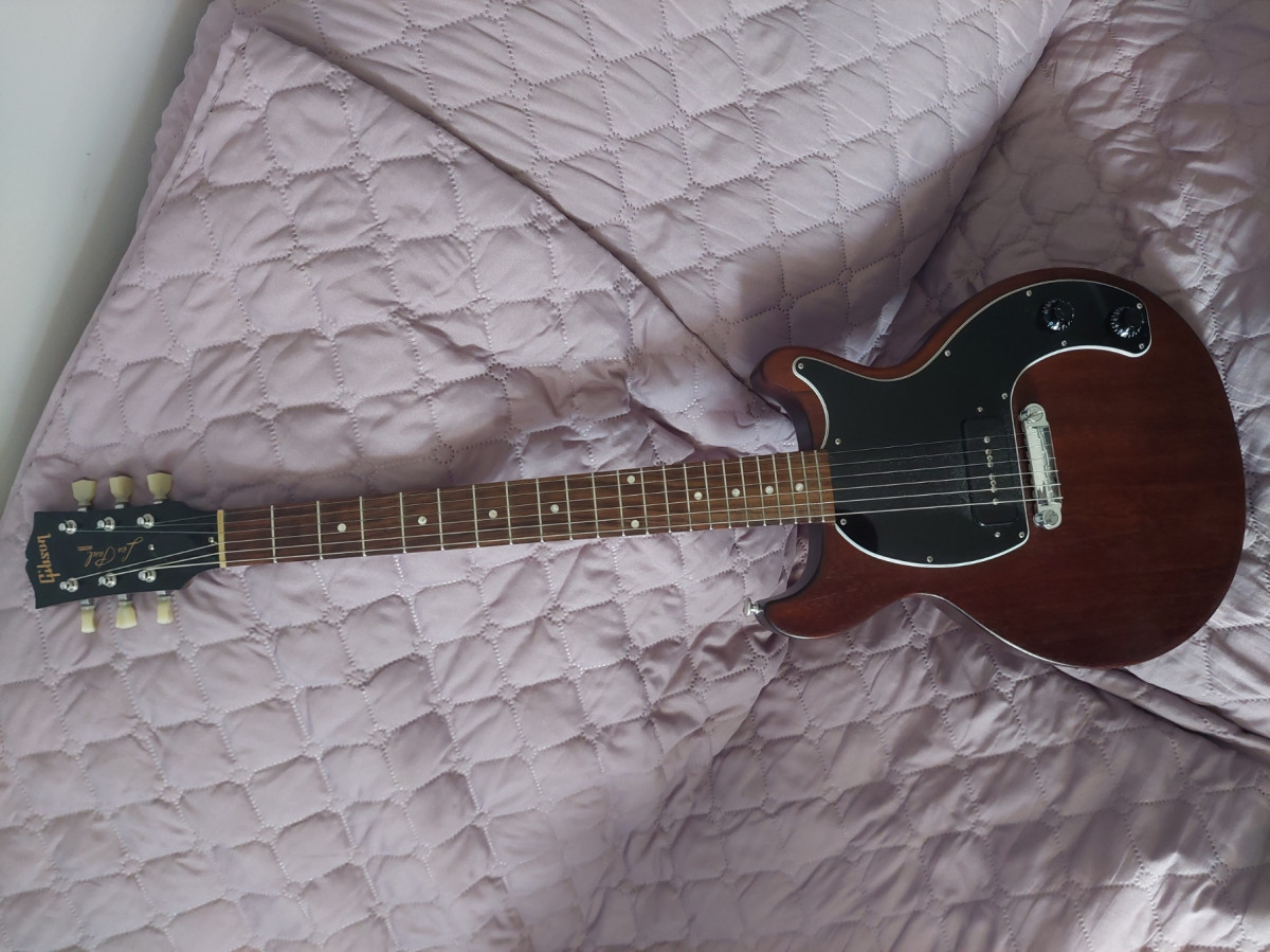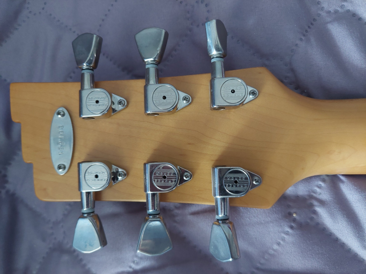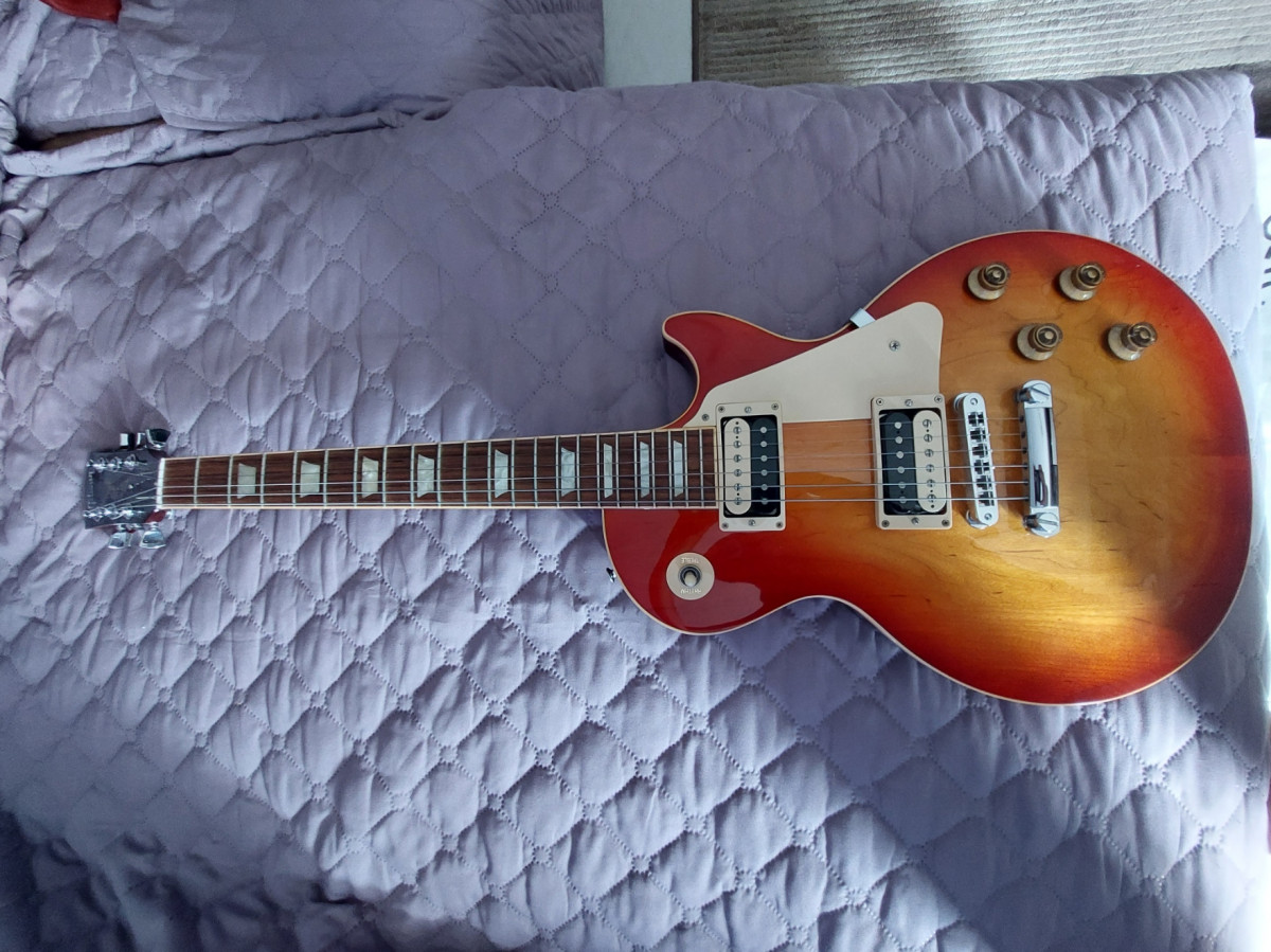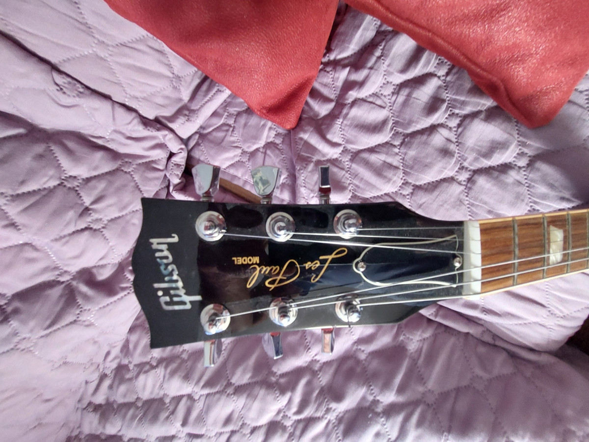 LP Junior Tribute. Achetee neuve chez Thomann en 2020. Une petite guitare nerveuse et sympa, si vous n'etes pas obsede par une intonation parfaite. Modifications: j'ai fait installer un sillet en os, et j'ai change les mecaniques par des Kluson a blocage, ce qui a regle les problemes de tenue d'accord initiaux. Les mecaniques originales seront incluses, pour la forme (pas terribles). Le remplacement s'est fait sans percage additionnel, les nnouvelles mecas etant 100% compatibles avec les anciennes.