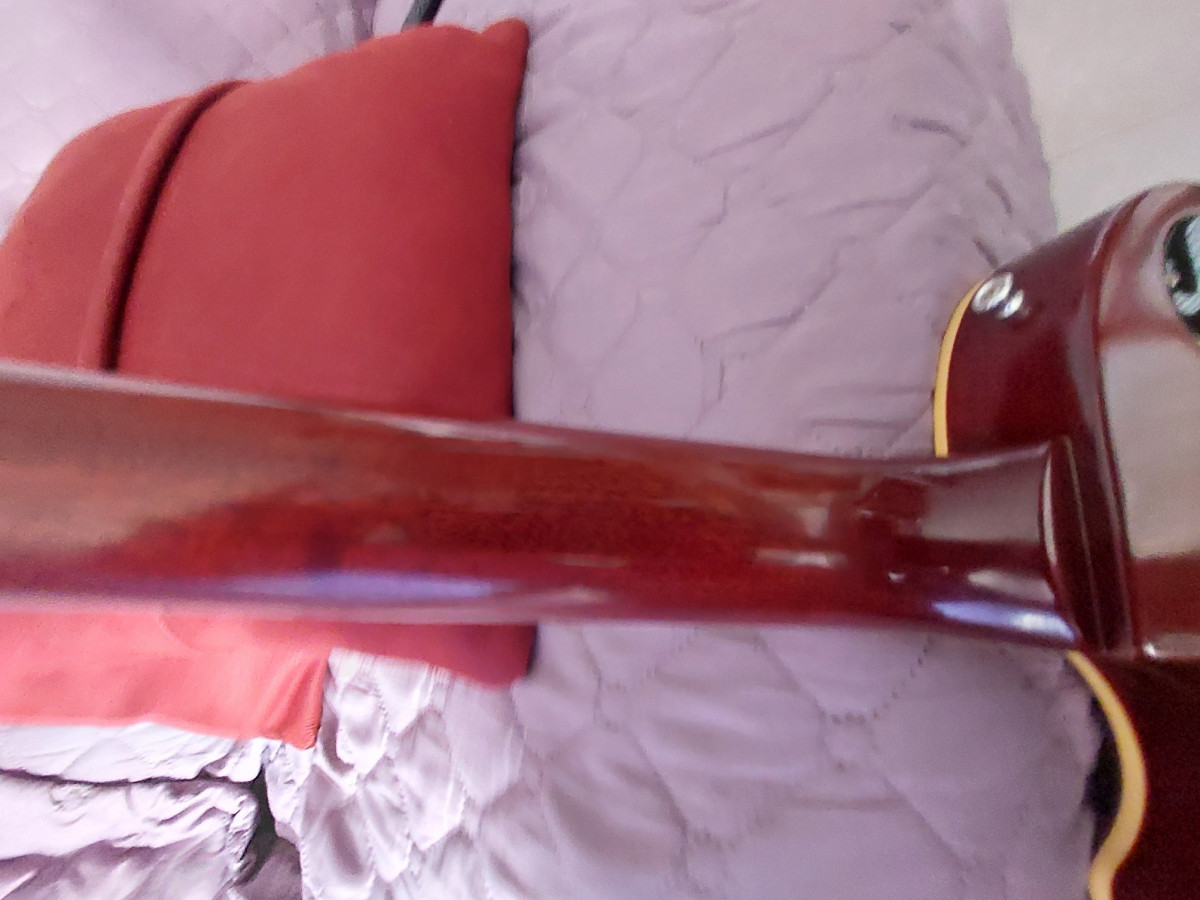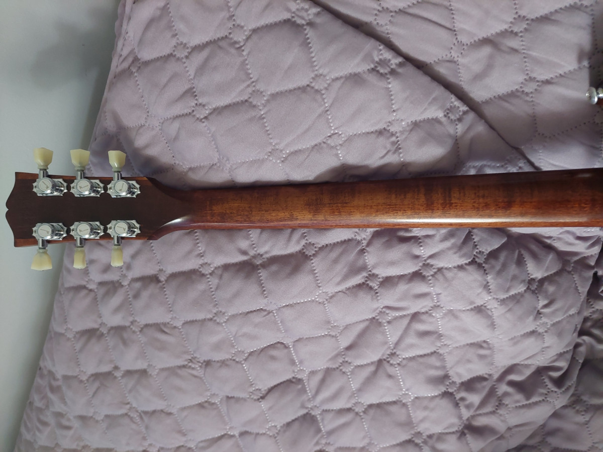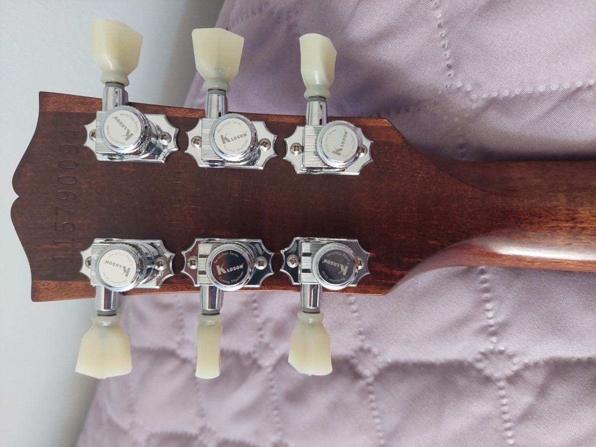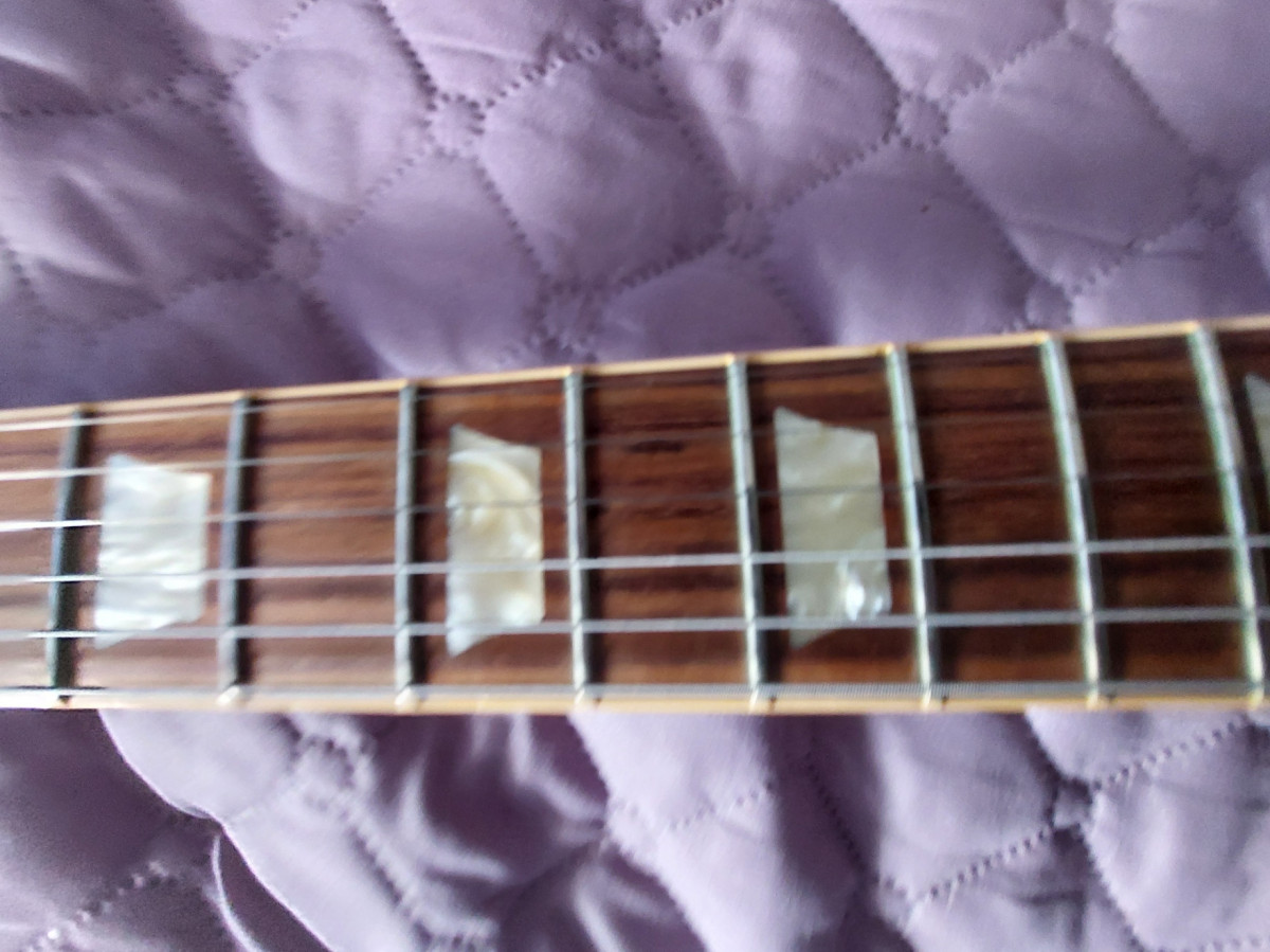 LP Junior Tribute. Achetee neuve chez Thomann en 2020. Une petite guitare nerveuse et sympa, si vous n'etes pas obsede par une intonation parfaite. Modifications: j'ai fait installer un sillet en os, et j'ai change les mecaniques par des Kluson a blocage, ce qui a regle les problemes de tenue d'accord initiaux. Les mecaniques originales seront incluses, pour la forme (pas terribles). Le remplacement s'est fait sans percage additionnel, les nnouvelles mecas etant 100% compatibles avec les anciennes.