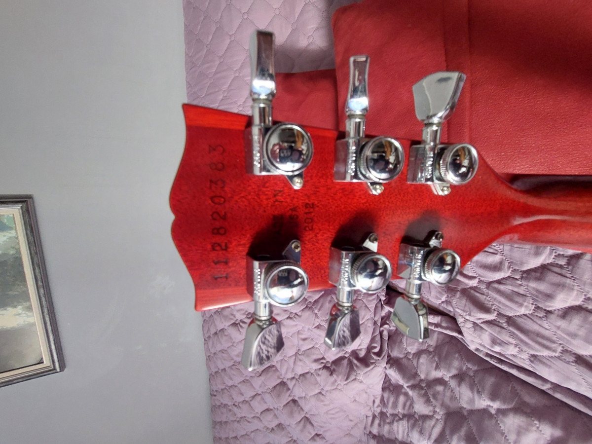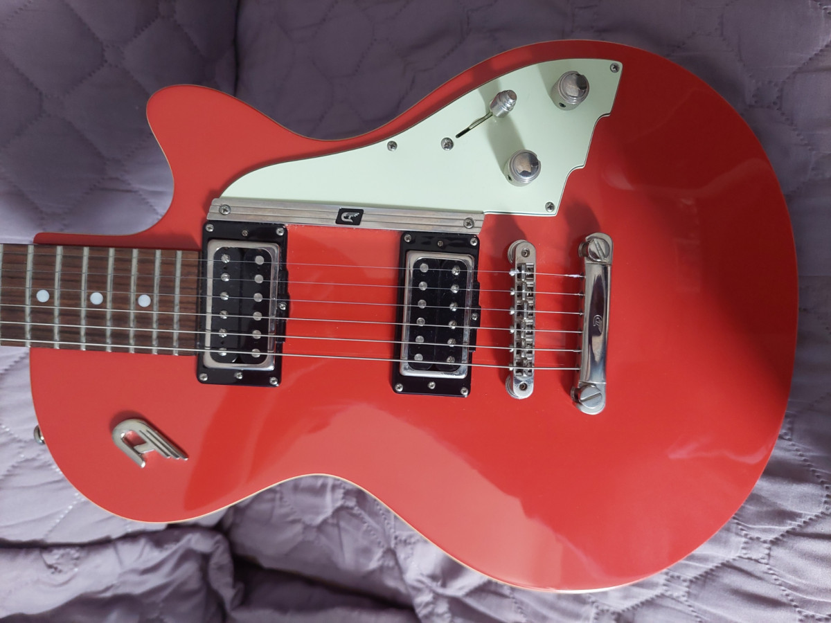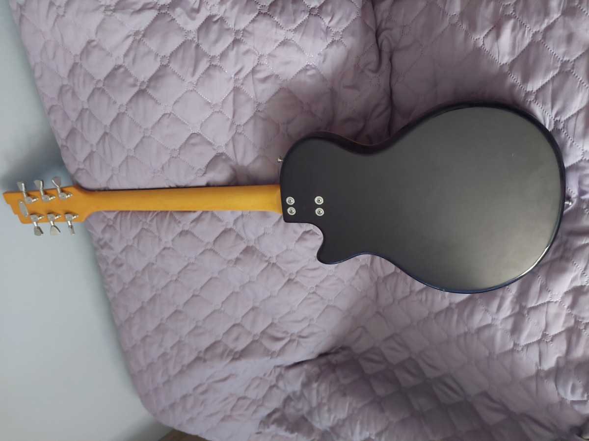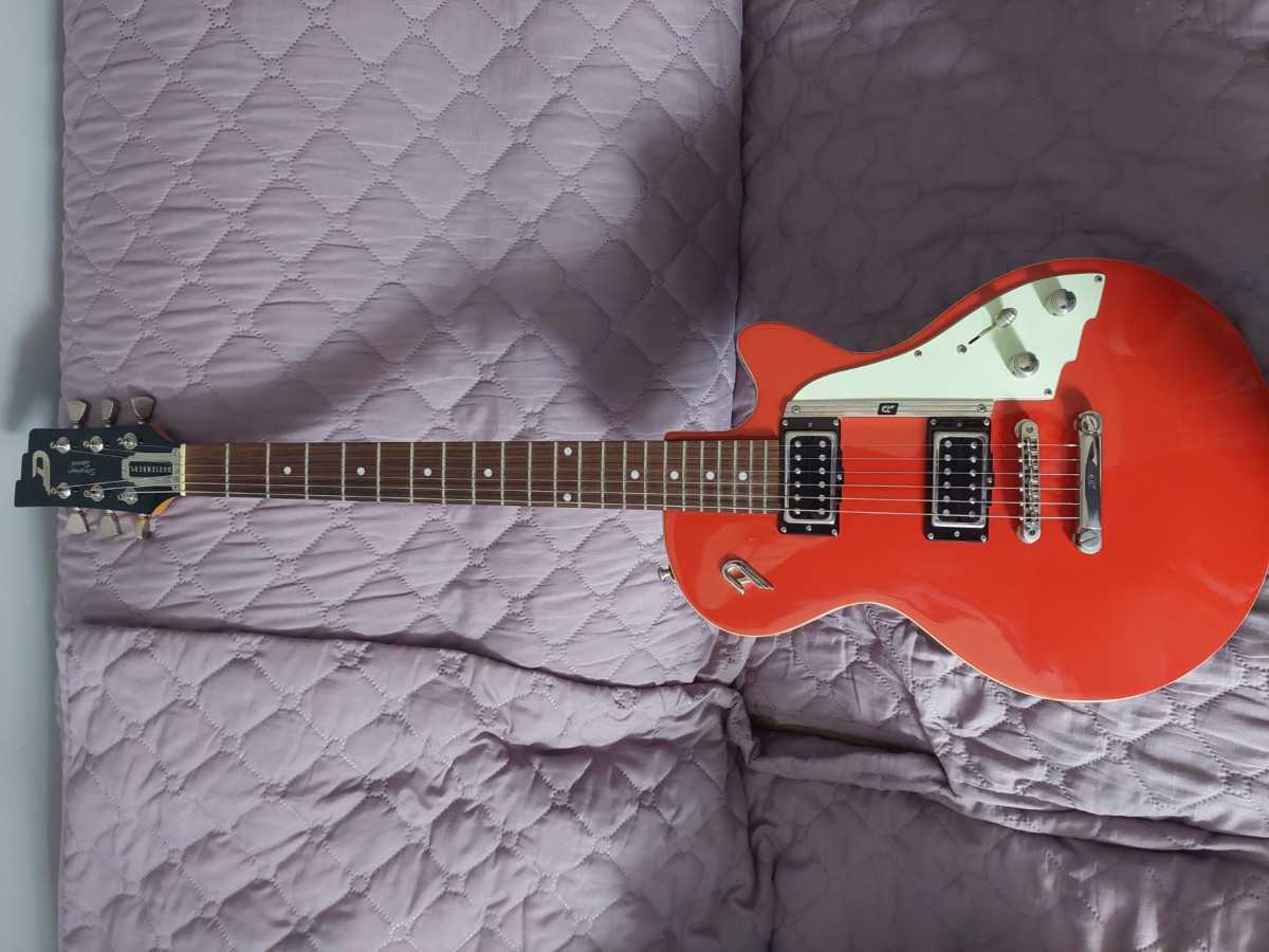 LP Junior Tribute. Achetee neuve chez Thomann en 2020. Une petite guitare nerveuse et sympa, si vous n'etes pas obsede par une intonation parfaite. Modifications: j'ai fait installer un sillet en os, et j'ai change les mecaniques par des Kluson a blocage, ce qui a regle les problemes de tenue d'accord initiaux. Les mecaniques originales seront incluses, pour la forme (pas terribles). Le remplacement s'est fait sans percage additionnel, les nnouvelles mecas etant 100% compatibles avec les anciennes.