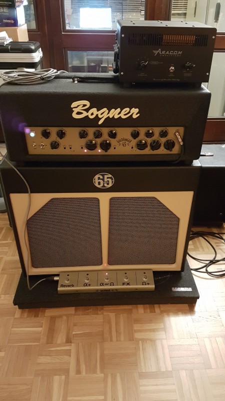 Je vends également la config complète que j’utilise avec le 2x12 65 Amps blue (HP Celestions G12H30 et Alnico Gold), un attenuateur ARACOM PRX150-DAG, et un support isolant Auralex GRAMMA.