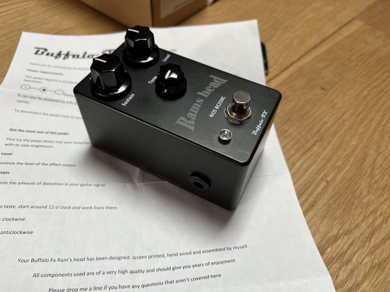Ram’s head des débuts de Buffalo Fx, qui ne produit plus d’effets. Format particulier car compact et un peu plus haut, avec un logement de pile accessible facilement. Big muff Ram’s Head typiqye 70, avec des mediums bien sympathiques, excellente pedale introuvable de nos jours !