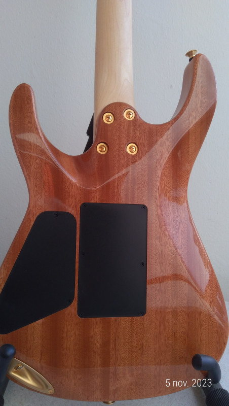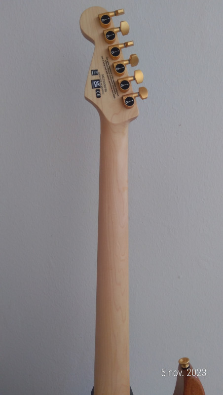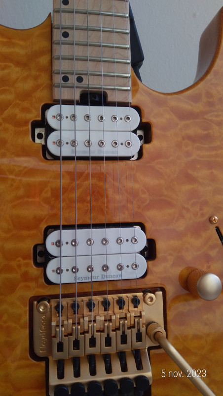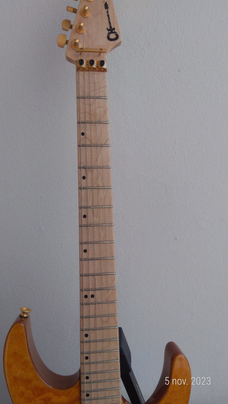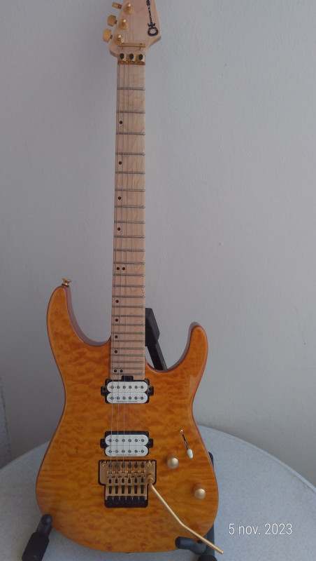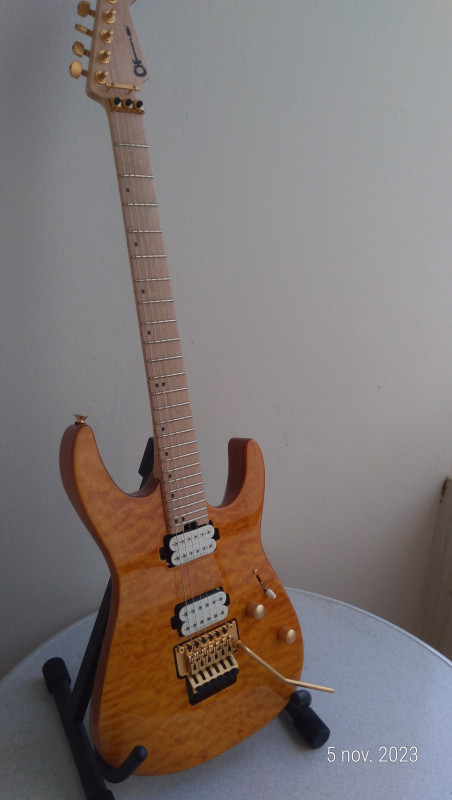 Série Pro-Mod Corps en acajou Table en érable moucheté Manche vissé en érable Touche en érable Repères "points latéraux" noirs 24 frettes Jumbo Sillet bloquant Floyd Rose 1000 Largeur au sillet: 42,86 mm (1,69") Diapason: 648 mm (25,51") Rayon de la touche composé: 304,8 - 406 mm (12" - 16") 1 micro Seymour Duncan Custom Full Shred SH-10B (chevalet) 1 micro Seymour Duncan Alnico II Pro APH-1N (manche) Contrôles: Volume et tonalité Sélecteur 5 positions Vibrato Floyd Rose 1000 double verrouillage Accastillage or satiné Mécaniques Charvel-Branded moulées sous pression Cordes NPS .009 - .042 Couleur: Dark Amber. Pas d’échange possible. Remise en main propre. Payement en liquide. 750 euro. la guitare est toute neuve: elle a seulement servi 2 ou 3 fois