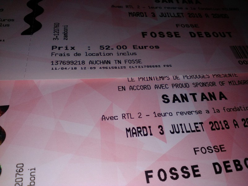 pour cause d'empêchement je ne peux pas aller au concert de Santana le 03/07 à Pérouges (Ain),je revends donc mes 2 billets.