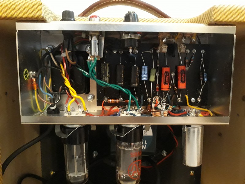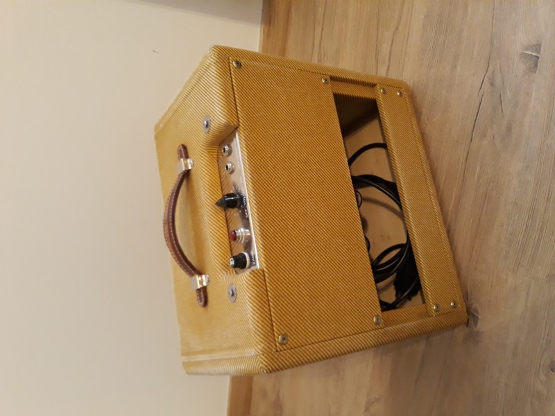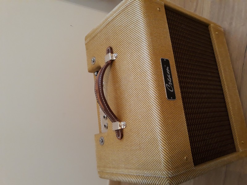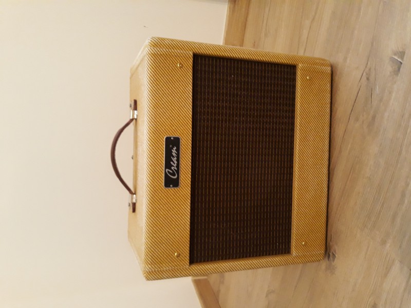 Je mets à la vente un Cream Exerciser en excellent état de la marque allemande Twinsound. Il s’agit d’un clone de Fender champ dans un cab custom façon wide panel des vieux tweed Deluxe.